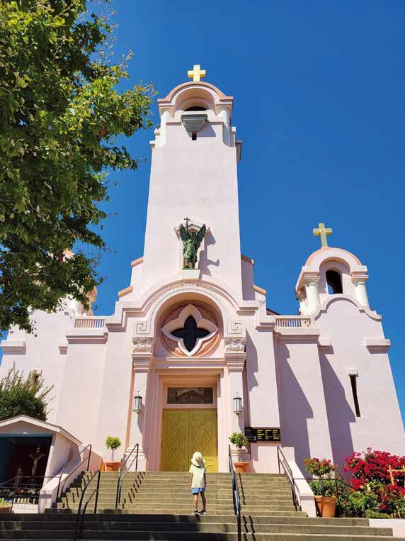San Rafael。來到San Rafael絕對不能錯過造訪 獨特的粉紅色西班牙殖民風格鐘樓Mission San Rafael,座落於第五大道上的廣場上。1769 年 至1823 年間,西班牙人在上加利福尼亞州建立 了21 個傳教所,其這裡是倒數第二個建立的傳 教所,僅次於1823 年的索諾瑪傳教所,相對也 較鮮為人知。粉紅色教堂與右手邊全尺寸複製 的教堂如今都是聖拉斐爾教會歷史建築群的一 部分。可惜的是粉紅色教堂兩扇 1960 年的義大 利青銅大門緊閉,原來粉紅教堂僅有週末才開 放參觀,於是我們參觀了右手邊紀念品店兼小 型博物館。