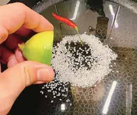 準備一大鍋水,放入米粒(水米的比例大 約10:1)、辣椒、檸檬汁