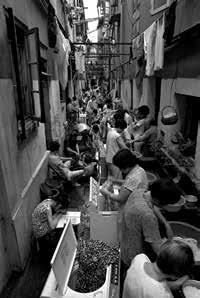 4-72家房客(1990年) 原本獨家擁有的空間,已被大家分 享,而人的智慧將空間利用到極致,哪有 你我之分?今天是星期六,小孩洗澡,學 生讀書,媽媽洗衣,外婆淘米...互不 干擾,井然有序;無形的指揮,無聲的韻 律,和諧的生活交響曲,洋溢在狹長的里 弄舞台。