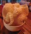 首先前菜上桌的是炸豬 皮,料理手法比較偏菲律賓一 些,炸得非常酥的豬皮灑上台 式調味料,旁邊搭配沾醬,吃 起來口感也很像蝦餅。