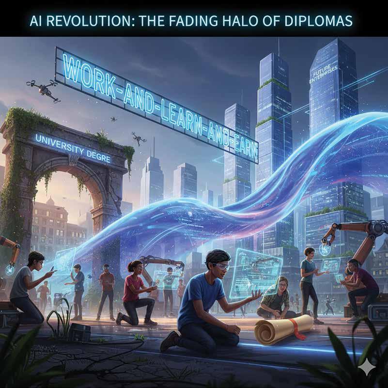 興起與落地應用,這項傳統的 職場準則正在面臨根本性的挑 戰。 AI 的普及不僅改變了工作 內容與效率,更深刻地重塑了 企業對於「人才」的定義與徵 才標準。我們正處於一個關鍵 的轉捩點:企業徵人將不再以 大學文憑為唯一標準,而「邊 工作邊學習並支薪」的模式, 正成為未來就業市場的一大趨 勢。 網路圖片