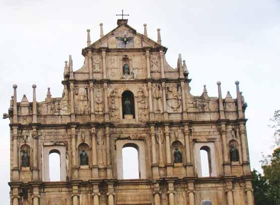 教堂與牌坊:信仰與歷史的殘章 當然,知性之旅的核心,不可避免地要指向澳 門最著名的地標——大三巴牌坊。它並非牌坊,而 是昔日聖保祿學院及其教堂遭受大火後僅存的前 壁。這座宏偉的石壁採用巴洛克風格,但細看之 下,卻能發現東方工匠參與的痕跡,例如雕刻在立 面上的漢字、菊花和石獅子。它不僅是四百年前遠 東最大的天主教堂之一,更是天主教文化與中華文 化融合的結晶,也是昔日耶穌會士在東方傳教的基 地,素有「東方梵蒂岡」的美譽。