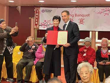 每年春宴最受歡迎的環節是向九十高齡或以上的高壽人士舉行「耆英祝 壽典禮」,這是一項極具意義的傳統。今年,共有三十位高壽長者參與祝壽 典禮,並獲三藩市市長丹尼爾 羅偉、第三區市參事李爾德及一眾嘉賓頒贈榮 譽證書及象徵健康長壽的「金桃頸鍊」,寓意福壽綿長,身體健康。其中, 全場最年長長者為九十九歲的 Pei Wen Huang、最年輕的高壽長者為九十歲的 Teresa Yee May Yee 。三十位高壽人士合共的歲數為二千七九十三歲。