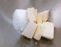 甜奶油醬作法 : 無鹽奶油切成小塊 狀,放入繳拌機中,倒入細砂糖 一起打至均勻鬆軟略顯白即可。