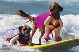 「World Championships for Dog Surfing以這項運動概念起源地的加 州海岸為基地,彙集衝浪狗天才,」賽事網站寫道。「衝浪狗被邀請為慈 善事業將金牌帶回家。」