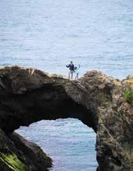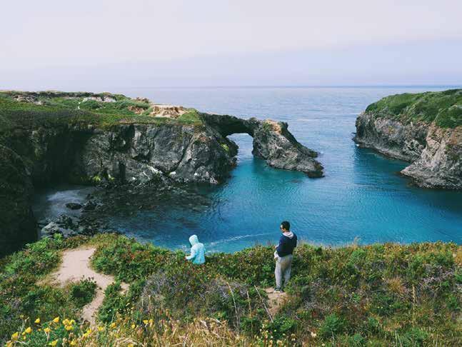 清晨,自療癒氣息濃厚的 Mendocino Grove 營地依依不捨地出發,短短十分鐘車程,即抵 達 Mendocino 海岸最具代表性的自然奇景—— Mendocino Headlands State Park。海蝕洞與天然 石橋構成了壯麗的景觀,遊客可親身站上著名 的「 Mendocino Arch 」拍照留念,感受大自然 風景的震撼。