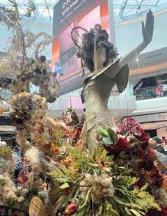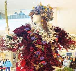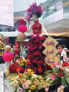 走進購物中心,最引人注目的莫過於一系列標誌性的鮮 花模特兒 (Floral Mannequins)。設計師們運用了萬朵蝴蝶蘭、 康乃馨、乒乓菊及各式乾燥植物,一針一線「縫製」出華麗的亞 洲傳統服飾與現代時尚禮服。每一尊模特兒不僅展現了卓越的手工 藝,更深刻詮釋了文化傳承的美感。