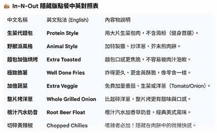 提到加州,除了陽光與科技, In-N-Out Burger 絕對是灣區人的靈魂支柱。雖然他們 的看板上只印了三種漢堡,但真正的內行人 ( Locals )點餐時都用 「秘密菜單」 (Secret Menu)。如果讀者喜歡吃In-N-Out Burger,下列 所列的各種點餐法都不列在正式餐單,有許多 餐點更是加料不加錢。