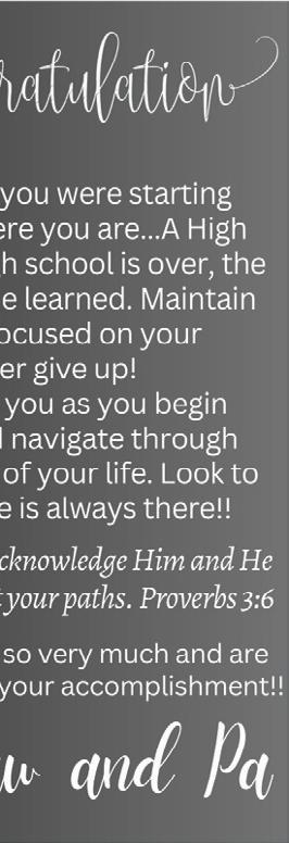 THIS IS PAGE D-2 CONGRATULATIONS TO OUR AREA GRADUATES! PLEASE REMEMBER THAT WE ARE IN 4 SECTIONS THIS WEEK, SECTION A, B, C & D LOTS TO SEE THIS WEEK! SPECIAL GRADUATION the new shopper • tuesday, may 9, 2023 Love, Mom and Dad Congratulations. We love you. AHS 2023 Your wing’s already exist. All you have to do is fly. We are so proud of you! Congratulations Porter!!! Love, Mom, Dad, Ameris, Madalyn and Dakota Colby We are so proud of the man you’re becoming. This is just the beginning. Love, Nana, Pops, Auntie, Derek and Addi Locklar 2023 CongRaTuLationS, KempeR “Go Confidently in the direction of your dreams. Live the life you have imagined” Henry David Thoreau Wishing You All The Best, Mom, Dad, Chase And All Your Family & Friends! CLiNe Congratulations JordynCooperTo My Baby Girl, I’m So Proud Of You! Can’t Wait To See What’s Next! Love You.... Dad & Debbie