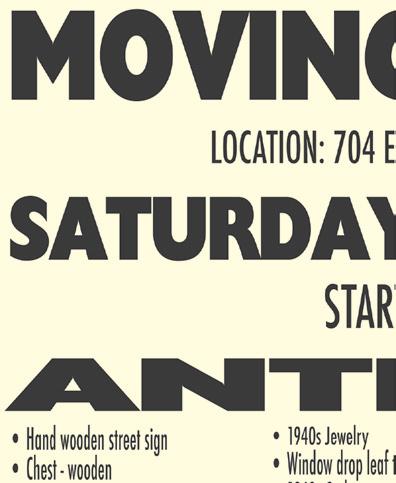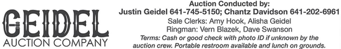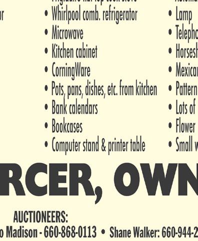 THE NEW DEADLINE FOR JUNE 13, 2023 ISSUE IS NO LATER THAN NOON ON THURSDAY, JUNE 8, 2023 WE’VE BEEN SERVING YOUR PRINTING & PUBLISHING NEEDS SINCE 1974 www.thenewshopper.net LIKE US ON FACEBOOK 101 WEST WOOD • ALBANY, MO. 64402 • PH.: (660) 726-5234 • FAX: (660) 726-5235 • E-MAIL:newshopper@windstream.net BULK RATE ECRWSS US POSTAGE PAID PERMIT NO. 10 ALBANY, MO. 64402 POSTAL PATRON CURRENT RESIDENT BOXHOLDER VOID IF DELIVERED BY ANY OTHER METHOD VOLUME 19 • ISSUE 17• TUESDAY, JUNE 6, 2023 Tammy Wynne-Siddens Agent Nelson Real Estate & Auction Co. 660-726-8104 tammyjsiddens@gmail.com NelsonSoldit.com Albany, Missouri 64402 BARNARD PROCESSING • USDA & CUSTOM MEAT PROCESSING Small Convenience Store On Site! www.barnardprocessing.com BARNARD, MISSOURI • GIVE US A CALL AND WE’LL BE HAPPY TO SCHEDULE YOUR CUSTOM BUTCHERING NEEDS!! • 660-562-7892 Farm retirement auction Featuring Late Model JD Tractors, Hay Equipment, Tillage Equipment, Tools including Craftsman & Snap-On, Woodworking Equipment Saturday, June 10, 2023 - 10 am Auction On Site at 12213 US Hwy 169 Grant City, MO North of Grant City on Hwy. 169 approx. 4-1/2 miles on east side of road. Live Online Bidding Available www.youngerauction.com For complete listings and pictures visit our website Mark Younger, Auctioneer 660-541-1977 Email: yac@youngerauction.com Jack & nancy Baker, ownerS TRACTORS • 2018 JD 5055 E Tractor, MFWD, equipped with 520M Loader with 7 ft. Bucket, Euro hitch, 278.3 hrs., 9.4-24” front rubber (90%), 16.9-28” rear rubber (90%), 12-spd trans., power reverse, 540 PTO, single hydraulic outlet • 2014 5100E, MFWD, equipped with Loader and 7 ft. bucket, 650 hrs., one owner, air ride seat, dual hydraulic outlets, 4 - rear wheel weights, 12-spd. trans. with power reverse, 540 PTO, 18.4-30” Goodyear Rubber with fluid, 12.4-24” front rubber (70%), has right hand steps, nice tractor TOOLS • LAWN & GARDEN: HOUSEHOLD: • 2 Wheel Dolly • Echo Chain Saw • Homelite Chain Saw 14”, electric • Tile Saw • DeWalt Angle Grinder • 16’ Extension Ladder • Step Ladders • Propane Tank • 1 Ton floor jack • Skil saw • Black & Decker Porter Cable Air Nailer • Jumper cables • Sprayer • 7” Polish Sander • Skil Jig Saw • Sawzall • Black & Decker Jig Saw • Electric Drill • Electric Stapler • Portland Pole Saw AUCTION DALE SHARP LoCATioN: 112 S. WrAy STrEET, PiCkEriNG, Mo 64476 oN SATURDAY JUNE 10, 2023 • 10:00 AM • Mini refrigerator •Hamilton Beach Microwave • Crockpots • Blender • Granite Wear Canner • Pie Pans • kitchen Aide Food grinder attachment • Tupperware • Silverware • Small Dutch oven • Crome Craft chairs w/rollers • Folding chairs • Chair cushions • Food Saver • Various pieces of glassware • Bread Maker • Various pieces of dishes • Pots & Pans • Baking Dishes • 4 Black office chairs • Bar Stools • Dining Table w/leaf, & 4 chairs • Glider rockers • End Tables • Floor Lamps • Lamps • 2 Brown Lazy Boy recliners, very nice • Love Seat • Pictures • LG TV • TV Stand w/glass doors • Maple Queen size bed • Adjustable beds w/remote & headboard • 2 oak dressers with open top for jewelry & mirror • 2 oak bedside tables with sliding top for jewelry and pullout for writing desk • Small desk w/chair • Carpet Cleaner • Vacuum • Bedding • Sewing & Quilters Supplies: Auction conducted By Scott Auction compAny - AlBAny, mo 64402 AuctioneerS: Sam Scott • (660) 726-5602 -- Shawn Deering • (660) 215-0668 Full listing and pictures of auction can be found at: www.shomemoreauctions.com LoCAL CLErkS • LuNCH oN GrouNDS • rESTrooM AVAiLABLE TErMS: CASH or VALiD CHECk W/ProPEr iD. (No CrEDiT CArDS ACCEPTED) – NoTHiNG rEMoVED uNTiL SETTLED For. Due to the possibility of incorrect information and typographical errors, the Auctioneer, owner, and Printer will not be responsible for any errors that might appear in this advertisement. However, every effort has been made to describe the sale items accurately. The Auctioneers announcement on the day of the sale will take precedence over printed advertising. Not responsible for accidents or theft. DALE