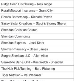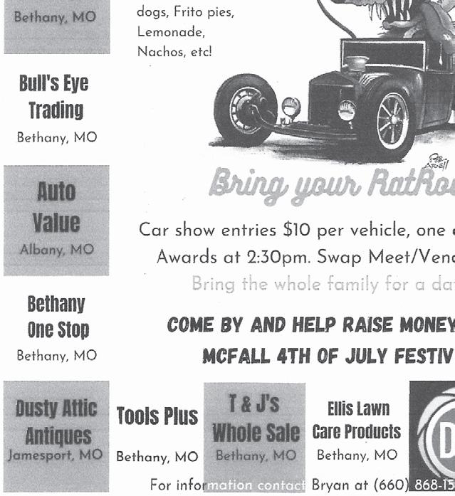 THE NEW SHOPPER • TUESDAY, JUNE 6, 2023 - PAGE 3 POLLY NELSON, OD GREG O’BRYAN, OD • Glaucoma • Eye Disease • Contacts For questions or Food Emergencies, please call 660-726-5818. Office Hours 8:00 - Noon, M-F. COMMODITIES & SENIOR BOXES (Gentry County only & you must qualify) Saturday, June 3, 2023 from 9:00 -10:30 a.m. SECOND HARVEST MOBILE FOOD PANTRY Available to Anyone Monday June 19, 2023 at 9:00 a.m. ALBANY METHODIST CHURCH FOOD MINISTRY DATES 302 N. Smith St., Albany, MO, 660-726-5818. Ministerial Alliance FOOD PANTRY OPEN (for Albany School District residents) Open Tuesday, June 6 & 20, 2023 from 9:00 - 10:30 a.m. at Methodist Church WALMART EXCESS FOOD Available to Anyone on Tuesday, June 6 & 20, 2023 from 9:00-10:30 GOINGWHAT’SHERE’S ON... AlbAny Community CAlendAr June 8 Albany Square Farmers Market 4:30 to 6:30 PM June 8 Stag Night at the Albany Country Club, 5:00 PM June 10 ACT Test Given June 14 Flag Day June 15 Albany Square Farmers Market On The Square With Music At The Market Featuring Brad Arndt June 15 Stag Night At The Albany Country Club - 5:00 PM June 16 Last Day Of Summer School June 16 Registration Deadlilne For The July 16 ACT Test June 16 Youth Tackle Football Registration Due to ACC Participants June 18 Father’s Day - Hug The Old Man! June 21 SUMMER BEGINS! June 22 Albany Square Farmer’s Market 4:30 To 6:30 PM June 22 Stag Night At The Albany Country Club - 5:00 PM June 30 ACC Youth Soccer Registration Due Get Your Raffle Tickets To Win A New 2022 John Deere XUV 835M. Hurry, As There Are Only 300 Tickets Printed & On Sale. You Can Get Your Ticket By Talking With An Albany Booster Club Member, At The AHS Superintendent’s Office, Hogue Lumber Or The New Shopper Office. • Albany Chamber Meets the 3rd Wednesday of Every Month at Noon at Poppa’s • Albany Rotary Meets every Friday at Noon at the Albany Community Center 1204 W. Hwy 136 Albany, MO ~ 726-5577 HOURS 10 AM - 9 PM MON. - SAT. Compliments of... Kevin Horner is a veteran comedian, ventriloquist, and magician. His unique style, voices, and adaptability spans all ages and personalities His timing, energy, and quick wit and reactions with all audiences is guaranteed to inspire uproarious laughter. Hired Gunʼs combined musical talents of over 100 years have been driving their love of classic rock, southern rock, and acoustic blues to their many followers across the Midwest for many, many years. Hired Gun is sure to bring you some of your favorite memories. The simplest way to describe The Girls Next Door is to say their voices make undeniable magic together... yet their sound is anything but simple. Hailing from Kansas City, The Girls Next Door is Eastern Heights is a modern country duo, with high energy, tight harmonies, and mind blowing musicianship. Eastern Heights consist of lead singer Rob Blackburn and lead guitarist Grant Moody. Although primarily a modern country band, the boys are very versatile and play multiple genres such as rock, pop, disco, funk, classic country, and todayʼs country to name a few. DOWNTOWN ALBANY, MISSOURI TABLE FOR 8...$17500 GENERAL ADMISSION $25.00 EACH SAVE THE DATE FOR JULY 1, 2023 TICKETS GO ON SALE STARTING MAY 1, 2023 CHECK THE ALBANY CHAMBER OF COMMERCEʼS FACEBOOK PAGE FOR ALL THE DETAILS ON TICKETS! the culmination of three solid solo voices that meld together to make the perfect female vocal blend. They bring a style thatʼs a little bit country, a little bit rock nʼ roll, with a whole lot of blood-rich harmony. The annual festival features live music, family entertainment, food, drinks, and more! Join us on Saturday, July 1, 2023 for the Albany Rhythm ‘N’ Roots Festival. Since 2012 we have celebrated Independence Day weekend with a live music festival around our historic courthouse. Watch the Albany Chamber of Commerce Facebook page for the most up-to-date information. CONCERT HELD RAIN OR SHINE! The Gentry Opry Great Music & Entertainment With... This Week’s Special Guests RICK HONTZ & CARLENE HALL FRIDAY, JUNE 9, 2023 Doors Open At 5:00 PM Supper Served At 5:00 PM SHOW STARTS AT 7:30 PM Concessions By T&L Cookshack Come & Enjoy Good Ol’ Country Music & Dancing!!! Northwest ChiropracticDr. Darcy Richardson Northwest Financial, LLCTammy Gage, Agent Northwest Missouri Tree Service Northwest Mo. Properties, LLC Pettijohn Auto Center - Albany/Bethany Pineview Manor & Assisted Living Porter Trash & Transfer Station Premier Ag, LLC Rob Luke Construction Robʼs Cycle Roberson Funeral Home Rod Dollars Auction Service Rogers Pharmacy Rural Missouri Insurance Agency, Inc Shelter Insurance Kent Peterson, Agency Simerly Collision & Restoration Stanberry Building Center Stanberry Market Steinyʼs Machine Shop Stingleyʼs Flower Shop & Greenhouse Strawboss Trucking T&S Machining, Inc. Tom Stoll Tara Wilmes Insurance, LLC The New Shopper, The Printery, Winners Circle Trophies & Awards North & Albany TV The Spec Shoppe Warrenʼs Restaurant Welgaard, CPA & Advisors Westfork Tire Wiederholt Truck Repair Aaron Jensen Concrete Bank Northwest - Stanberry Bar-G Trucking Kenny & Amanda Greenland Big 4 Hardware & Napa Auto Bill Wiederholt Construction City of Stanberry Creative Cuts Crouse & Crouse, Inc. D&D Auto Parts Daniel Jensen Auto Repair Darren Luke Construction Design-It Donnell Slagle Construction, LLC Eckardʼs Home Improvement Edsonʼs Custom Processing Edward Jones - Jeff VonBehren Elite Floor Covering Jodee Beggs Fallon Stiens, DDS Family Dentistry G & G Construction & Remodeling Gambinoʼs HNB Bank Hughes Body Shop Jʼs Taste “E” Freeze Jensen Cellulose Insulation Jensen Customs Jensen Floor Covering Installation Jensen Mfg. King City Lumber Louʼs Antiques & Gifts Pam Jensen MFA Oil Co., Stanberry Mosaic Health Care Noble Furnace & Air Nodaway Valley Bank Maryville FREE SPECTATOR ADMISSION! COME ENJOY& THANK YOU TO THESE SUPER SPONSORS FOR THEIR SUPPORT, HELPING TO MAKE THIS POSSIBLE! 40th DASH PLAQUES FOR THE 1st 150 ENTRIES CELEBRATI