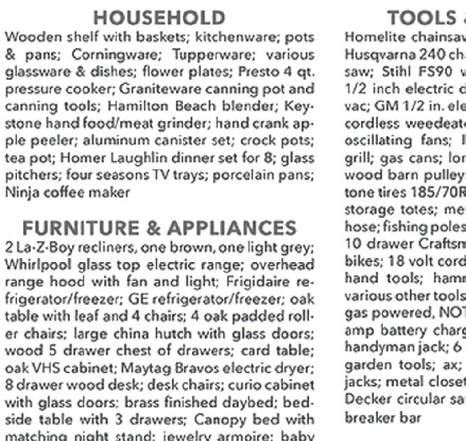Kenmore stainless steel refrigerator; Estate refrigerator; Kenmore refrigerator; Gibson upright deep freeze; Maytag upright deep freeze; Maytag Elec dryer; Maytag washing machine; nice 4 pc. queen size bedroom suite; 3 pc. full size bedroom set; Grandfather clock; towels and wash cloths; linens; Elec recliner; Flex Steel couch; multiple sets of dishes & silverware; kitchen appliances; 6 flat screen TVʼs 24”-55”; his & hers leather recliners; nice oak dining table and 6 chairs; Dell desktop computer and printer; 3 curio cabinets; 2 microwaves; cutting boards; Pitboss Platinum Laredo pellet grill; 2 poly outdoor gliders; oak glider; air purifier; lamps; seasonal wreaths; floor lamps; 4 hall trees; card tables; suitcases and handbags; baby bed; Christmas decorations; file cabinets; wheel chair; elec. Hospital bed; 2 Elec fireplaces; Fortress small safe; hide a bed couch; 2 roll away beds; Western books; walnut office desk; 4ʼ and 6ʼ Lifetime folding tables; Yeti Tundra 75 cooler; coolers; bird feeders; bird houses; 5 ½”x12” marble fireplace mantle; several fish fryers; Aruba 10 kayak; large Traeger smoker; Weber 6 burner stainless steel grill; Blackstone Flat Top griddle; 20# propane tanks; Lifetime picnic table.