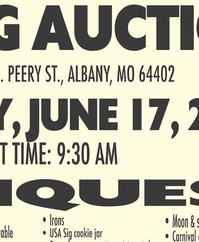 Bred for added end product value OSBORN LIVESTOCK AUCTION Located 7 miles West of Cameron on HWY. 36, OSBORN, MO Danny 816-675-2424 or 816-695-0504 Randy Vanderkooi, Fieldman 816-632-0694 Ivan Kanak, Fieldman 816-724-1043 Jayme Walker 816-665-4277 Transportation and order buying available • Bonded • Insured Barn Phone: 816-675-2424 SALE EVERY FRIDAY! RECEIVING HOURS: Daily until sale time. MARKET REPORT: May 18 Sale Top Butcher Cow - $0.68 Top Bull - $0.81 246 Butcher Cows Sold. Buying Butcher Cows & Horses Daily We currently have 5 butcher cow buyers. NEXT SALE FRI, June 1st 11:30AM SALE EVERY WEDNESDAY | 11:00 a.m. Buying Butcher Cows & Horses Daily We Have 9 Butcher Cow Plants Represented Barn Phone: (816) 675-2424 (816) 649-8485 Transportation and Order Buying Available • Bonded • Insured Danny RECEIVING HOURS: Daily until sale time EXPECTING 3 COW DISPERSALS WEEKLY CHECK FACEBOOK SUNDAY FOR DETAILS Owner, Jayme Walker 816-665-4277 Randy Vanderkooi, Fieldman 816-632-0694 Ivan Kanak, Fieldman 816-724-1043 Frank Peterson, Fieldman 660-247-2306 Dale Coble, Fieldman 816-213-3581 Todd Gottswiller, Fieldman 816-390-7917 Gary Mann, Fieldman 816-294-5849 Bill Bray, Fieldman 816-724-0438 Gary Jackson, Fieldman 816-724-4348 Dennis McDowell, Fieldman 816-646-6634 300#........................................$3.03 .............................................$2.66 400#........................................$2.85 .............................................$2.38 500#........................................$2.63 .............................................$2.25 600#........................................$2.50 .............................................$2.07 700#........................................$2.25 .............................................$2.00 800# .......................................$2.20 .............................................$1.84 900#........................................$2.00 .............................................$1.75 1000#......................................$1.84 .............................................$1.73 1100# Fats ..............................$1.68 .............................................$1.63 STEERS HEIFERS Top Cow: $1.13 - Carrollton Top Bull: $1.29 - Richmond Holsteins & Longhorns: $0.85 - $1.17 Longhorn X & Dairy X: $1.18 - $1.39 1137 CATTLELASTWEEK| EXPECTING 1000 THIS WEEK GOT TIRED FLOORS? WE CAN HELP!!! ALL OF OUR 12 MIL LVP LUXURY VINYL PLANK FLOORING WATERPROOF! ATTACHEDPAD SCRATCHRESISTANT WAS$3.99SQ.FT. NOW JUST... PER SQ. FT. ECKARD’S HWY. 69 NORTH • BETHANY, MO. 64424 • 660-425-6331 OPEN: MON. - FRI. 8:00 -5:00 SATURDAY 8:00NOON EDNA CHERRY AUCTION SATURDAY, JUNE 24, 2023 • 10:00 AM Location: 203 S. College Street, Albany, MO 64402 SELLING: Wood Working Equipment, Tools, Antiques, Collectibles, Household & Miscellaneous. AUcTIoNEERS NoTE: There are still boxes of miscellaneous items, too numerous to mention, that have not been gone through at the time of advertising. This will be an auction that you will not want to miss. SEE NEXT WEEK’S NEW SHOPPER FOR THE FULL LISTING EDNA CHERRY AUCTION CONDUCTED BY ScoTT AUcTIoN coMpANY - ALbANY, Mo 64402 AUcTIONEERS: Sam Scott • (660) 726-5602 -- Shawn Deering • (660) 215-0668 Full Listing and pictures of auction can be found at: www.shomemoreauctions.com LocaL cLerks • restroom avaiLabLe terms: cash or vaLid check w/ProPer id. (no credit cards accePted) – nothing removed untiL settLed for. due to the possibility of incorrect information and typographical errors, the auctioneer, owner, and Printer will not be responsible for any errors that might appear in this advertisement. However, every effort has been made to describe the sale items accurately. The Auctioneers announcement on the day of the sale will take precedence over printed advertising. not responsible for accidents or theft. CONTACT ONE OF OUR FIELD REPS.: James Hudgens, Maysville, Mo. 660-541-0425 Mike Freiden, Faucett, Mo. 816-248-1926 Todd Gottswiller, Clarksdale, Mo. 816-390-7917 Thomas Linville, Burlington Jct., Mo. 660-725-7032 Greg Clement, Maitland, Mo. 816-387-3652 Merrill Karr, St. Joseph, Mo. 816-271-3880 Clint Larison, Sheridan, Mo. 660-562-9813 Evan Yoder, Maryville, Mo. 660-254-4034 Maria Espey, Maryville, Mo. 660-215-8830 Russell Redden, Maryville, Mo. 660-254-7020 Kyle Marriott, Braddyville, IA 712-370-4651 Charley Allen, Skidmore, Mo. 660-541-0592 SHEEP & GOAT AUCTION 2ND FRIDAY OF THE MONTH AT 3:00 PM FOR MORE INFORMATION CONTACT: EVAN YODER AT (660) 254-4034 OR ANDREW WEGE AT (785) 364-6612 CATALOG HORSE SALE TO CONSIGN CONTACT: TODD GOTTSWILLER AT (816) 390-7917 OR BRYCE PRUETT AT (785) 824-8107 MARYVILLE LIVESTOCK AUCTION 22783 STATE HIGHWAY 71 MARYVILLE, MISSOURI 64468 PH.: 660-562-2026 Looking For A Market To Sell Your Livestock? WE ARE OPEN FOR BUSINESS! CATTLE SALES THURSDAY AT 10:00 AM VISIT OUR WEBSITE AT: www.maryvillelivestock.com Find Us On Facebook SUMMER SCHEDULE EMAIL US AT: maryvillelivestock@gmail.com Visit Us On The Web At: maryvillelivestock.com Sign Up For Phone Text Notifications By Calling 660-562-2026 SHEEP & GOAT SALES 2nd FRIDAY OF EVERY MONTH June 1 • No Sale June 8 • Sale June 15 • No Sale June 22 • Sale June 29 • No Sale July 6 • Sale July 8 • No Sale July 15 • Sale July 22 • No Sale COWS AT 9:00 AM CALVES AT 11:00 AM BLACK DIRT FOR SALE BY THE LOAD! BRANDEN WILSON ALBANY, MO. (816) 390-4209 KEVIN WILSON ALBANY, MO. (660) 726-8010