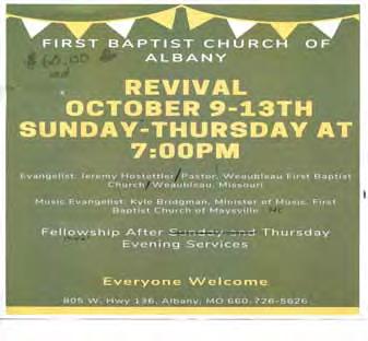 Evangelist: Jeremy Hostettler, Pastor Of Weaubleau First Baptist Church Weaubleau, Missouri Music Evangelist: Kyle Bridgeman, Minister of Music Of First Baptist Church of Maysville, Missouri Fellowship Meal After Thursday Evening Services Everyone Welcome! 805 W. Hwy 136, Albany, MO • 660-726-5626 Higher Purpose Group of Narcotics Anonymous Wednesdays at 7:00 pm 22 West 4th St. Grant City, Missouri Contact: 641-289-0447 If you are struggling with any form of addiction, let Narcotics Anonymous help. Oct. 20th Al ban y TV Here’s What’s Coming Up On Albany TV! Albany TV Guide Football At Pattonsburg With The Time To Be Announced Take Note This Is A Thursday Night Game! Oct. 13th Football At King City At 6:00 PM Take Note This Is A Thursday Night Game! October 13 - Football Away at King City at 6PM October 20 - Football Away at Pattonsburg at TBA Fall Harvest DINNER! SATURDAY OCTOBER 15, 2022 SERVING FROM 11:00 AM TO 1:00 PM FREE WILL DONATION!!! Eat In, Carry-Out or Delivery Serving: Ham, Turkey, Dressing, Mashed Potatoes, Noodles, Corn, Green Beans, Homemade rolls, Assorted salads, Pies & Drinks HAMMER MEMORIAL UNITED METHODIST CHURCH 116 N. CONNECTICUT KING CITY, MISSOURI 64463 NOTICE! CITY OF MCFALL, MISSOURI the City of McFall, MO is taking bids for snow removal on the city streets for the year of 2022-2023. please mail your bid to: City of McFall pO Box 165 McFall, MO 64657 Bids must be submitted by November 15, 2022. PAYING TOO MUCH for Medicare Supplements? Call me. RON PETERSON, 660-783-2526. FOR Rent new seLF-stORage unIts, upstaIRs, in addition to the basement units. Various size and prices, at the southeast corner of the square in albany. Call 660-726-5500