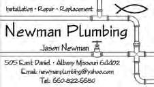 page 8 - tuesday, NOVeMBeR 1, 2022 - the New shOppeR Records For Gentry County! • You Will Receive Over 100 Year Search When You Receive Title Work From Holden Abstract! MORE THAN JUST PAPER & WORDS! EXPERIENCE & PEACE OF MIND NOBLE FURNACE & AIR NEW SALES • SERVICE • REPAIR WE SELL & INSTALL NEW FURNACES & AC UNITS!!! 4526 340th St. • STANBERRY, MO. 64489 • 660-783-5190 GENE CELL • 660-783-2703 HOMEP Attorney At Law General, civil and criminal practice Including probate wills, trusts, real estate, criminal and traffic defense. 108 West Wood Street, P.O. Box 187, Albany, MO 64402 Phone 660-726-5500 David B. Parman, LLC Jessica J. Jones Law, LLC contact@jessicajonesmolaw.com Caleb Newman • Albany, Mo. 64402 Call 660-822-6683 RESIDENTIAL & COMMERCIAL ELECTRICAL SERVICE & REPAIR • NEW INSTALLATIONS • REMODELS • NEW CONSTRUCTION • TROUBLE SHOOTING • WE WANT YOUR BUSINESS STANBERRY • 660-783-9075 ALBANY • 660-726-3919 BETHANY • 660-425-3733 Warner Bros. Heating & Air, LLC “Quality Equipment & Service You Can Depend On” Heating • Air Conditioning • Refrigeration Duane Warner Business: 660-564-2159 Cell: 660-562-8906 Grant City, MO 505 East Daniel • Albany, Missouri 64402 Email: newmanplumbing@yahoo.com TELEPHONE: 660-822-6680 • Installation • Repair • Replacement JASON NEWMAN LLC CALL US FOR ALL YOUR PLUMBING NEEDS! Albany, Missouri 64402 “your first choice in eyecare” Family Eyecare • Contact Lenses • Cataract • Glaucoma • Diabetes • Emergency Eyecare AnthonyJ.Verachtert,O.D. Scott D. Staatz, O.D. • 2707 Miller St. •Bethany,Mo.64424 •(800)737-1113 •(660)425-8116 •Fax:(660)425-3418 Bethany eye center 700 E US Hwy 136 • Albany, MO 64402 Office: 660-726-3008 • Cell: 660-726-8100 insagent@windstream.net Sandra J. Youngs, Agent AVAILABLE NOW!!!! EASTRIDGE APARTMENTS • 1 Bedroom Units • Utilities FUrnished • rent BAsed on inCome Now Taking Applications Call Kelsey • manager P.o. Box 234 • Albany mo 64402 660-822-1019 or 660-254-4433 EQUAL HOUSING OPPORTUNITY Hit A Critter With Your Vehicle... Bring it to us to fix... Smith Body Shop Hwy. 136 East • Albany, Mo. • 660-726-3223 LIKE US ON FACEBOOK RAYMOND SMITH BODY SHOP LLC Since 1953 GIFT CERTIFICATE ON US FROM ONE OF THESE LOCATIONS. POPPA’S • GIRRATONO MEAT CO. • HY-VEE B&B BBQ • BAR X • SHOATS • DEB’S DINKY DINER ... We Buy Dinner! Rob’s Cycle PARTS • SALES • SERVICE ROB BOZARTH 101 N. 2ND AVE. • PATTONSBURG MO 64670 660-367-4407 888-669-5765 www.robscycle.com Rob bozaRth #1 Polaris Drive • Pattonsburg, Mo 64670 Open: Monday Thru Friday MANUFACTURING JENSEN Open: Monday Thru Friday • BALE RINGS IN STOCK! Mark Jensen 4510 US Hwy. 136 • •• Stanberry, Mo. (660) 783-0055 Give Us A Call For All Your Automotive Repair Needs! • STOCK TRAILER REPAIRS! CUSTOM WELDING! JENSEN Automotive Repair Daniel Jensen, Owner •• 4508 US Hwy. 136 •• Stanberry, Mo. Call Today: (660) 783-2444 We Want Your Business!! Marci Sager Agency Formerly Farmers Mutual Insurance Agency Give Me A Call Or Stop By & Let Me Help You STOP BY AND CHECK OUT OUR SELECTION OF... ECHO CHAIN SAWS! WE HAVE GREAT PRICES ON THESE GREAT SAWS! GRANT CITY AUTO PARTS 15 EAST THIRD ST. IN GRANT CITY, MO. • (660) 564-3713 Lumber & Building Supplies Of All Kinds! SEE US BEFORE YOU BUY! • WE’LL TREAT YOU RIGHT!!! WORTH COUNTY LUMBER, INC. DENNIS DOWNING, OWNER Grant City, MO 64456 Phone (660) 564-3384 Fax (660) 564-3614 • SHINGLES • • NAIL GUNS • • SHEETING • • VINYL • •SIDING• NEW HOME & OUTBUILDING CONSTRUCTION LET US BUILD YOU A NEW GARAGE TODAY! GRAND RIVER TITLE, INC . Linda Collins 1500 MAIN ST., BETHANY, MISSOURI 64424 Phone: 660-425-6833 Fax: 660-425-6855 Email: linda@missouricentraltitle.com•www.missouricentraltitle.com Email:lindac@missouricentraltitle.com AUTO VALUE PARTS STORES 219 W. Clay St. • Albany, MO 64402 Auto Value PARTS STORES Bus. 660-726-3939 • WATS: 877-726-3939 Fax: 660-726-3982 “The Parts You want... The Value You Expect” LOCATED AT THE CAUTION LIGHT AT THE JCT. OF HWYS. 136, 85 & RTE. C ON THE NORTH SIDE OF THE HIGHWAY 660-726-3939 TOLL FREE: 877-726-3939 FAX: 660-726-3982 Rick Naylor Broker 109 W. Jackson Albany, MO 64402 704 E US Hwy. 136 • Albany, Mo. (Behind Youngs Insurance Agency) TANNING 24/7!! TUESDAY - FRIDAY 9:00 TO 5:00 AMBER • 660-726-3192 Set Your Clocks Back 1 Hour! November 6! 2022RHONDA’S UPHOLSTERY and Refinishing. Contact me at 660726-3741 for all your upholstery and refinish needs. Pickup and delivery available. Albany, MO. PAYING TOO MUCH for Medicare Supplements? Call me. RON PETERSON, 660-783-2526. BLACK ANGUS BULLSExcellent quality & disposition, several AI sired, some yearlings, 18 month & 2 year olds. FREE DELIVERY! GREG FRUEH, Hopkins, MO, 660-582-6901. WANTED Brush and CRP Clearing, Stump Grinding, Skid Loader Work. Call Lee Zweifel at 660-439-2889 or 605-359-2563. Leave message.