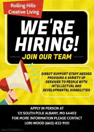 be willing to obtain a credential or certifi cation in social work, human services, family services, counseling or a related field. must be willing to obtain a class c-cdl, with passenger School Bus endorsement. this position is for 40 hours/week, 36 weeks/year. apply at the community Services, inc., 1212 B South main, maryville, missouri. Applications will be accepted until qualified applicant is found. For more information call 660-582-3113. eoe. STILL hIrIng QUALITY WOrK STAFF 1204 W. Hwy 136 Albany, MO ~ 726-5577 HOURS 10 AM - 9 PM MON. - SAT. HELP NEEDED.... Pine View Manor “There’s Someplace Like Home” 307 North Pineview Street • Stanberry, Mo. 64489 (660) 783-2118 EOE/MFVD IF THIS SOUNDS GOOD TO YOU, COME JOIN OUR STAFF & BECOME PART OF OUR FAMILY! • GREAT BENEFITS WITH HEALTH INSURANCE • COMPETITIVE WAGES • AWESOME INCENTIVES • SHIFT DIFFERENTIAL • QUARTERLY CA$H BONUSES Caring, Dependable, Compassionate, Team Player Wanted For The Following Positions: • NA • CNA • LPN • RN WE WILL PAY FOR TRAINING!