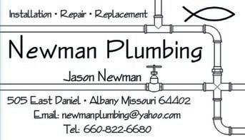 THE NEW SHOPPER - TUESDAY, FEBRUARY 28, 2023 - PAGE 7 Caleb Newman • Albany, Mo. 64402 Call 660-822-6683 RESIDENTIAL & COMMERCIAL ELECTRICAL SERVICE & REPAIR • NEW INSTALLATIONS • REMODELS • NEW CONSTRUCTION • TROUBLE SHOOTING • WE WANT YOUR BUSINESS 505 East Daniel • Albany, Missouri 64402 Email: newmanplumbing@yahoo.com TELEPHONE: 660-822-6680 • Installation • Repair • Replacement JASON NEWMAN LLC CALL US FOR ALL YOUR PLUMBING NEEDS! Albany, Missouri 64402 Floral, Gifts, Home Decor 660-425-6400 Monday - Friday 9:00 AM - 4:30 PM Saturday 9:00 AM - 2:00 PM • Closed Sundays 16100 W US Hwy 136, Bethany, MO TAKING ORDERS IN STORE, BY PHONE & ON FACEBOOK! DAVIESS COUNTY LIVESTOCK MARKET 912 W. Grand • Gallatin, MO 64640 • Find Us On Facebook! The Barn 660-663-2177 Dave Cannon 515-442-3003 • Troy Jennings 660-373-1995 Barry Boos 816-262-3060 • Joseph Gingerich 660-654-3120 Check our WEBSITE for current sale information... www.DaviessCountyLivestockMarket.com CATTLE SALES SPECIAL FEEDER CATTLE SALE ~ WED, MAR 1 @ 11 AM BRED COW SALE ~ SAT, MAR 11 @ NOON @11 AM EVERY WEDNESDAY For All Your PROPANE Needs Schoonover Oil Co., Inc. Serving Northwest Missouri And The Surrounding Areas Since 1952 660-442-5727 800-472-1310 Free Leak Check For New Customers Until March 31, 2023 SALE EVERY WEDNESDAY | 11:00 a.m. Buying Butcher Cows & Horses Daily We Have 9 Butcher Cow Plants Represented Barn Phone: (816) 675-2424 (816) 649-8485 Transportation and Order Buying Available • Bonded • Insured Danny RECEIVING HOURS: Daily until sale time 1 COW DISPERSAL - LIBERTY & 1 COW DISPERSAL - LAWSON Top Cow: $1.06 - Eagleville Top Bull: $1.30 - Buckner Holsteins & Longhorns: $0.60-$1.00 Longhorn X & Dairy X: $1.01-$1.22 Owner, Jayme Walker 816-665-4277 Randy Vanderkooi, Fieldman 816-632-0694 Ivan Kanak, Fieldman 816-724-1043 Frank Peterson, Fieldman 660-247-2306 Dale Coble, Fieldman 816-213-3581 Todd Gottswiller, Fieldman 816-390-7917 Gary Mann, Fieldman 816-294-5849 Bill Bray, Fieldman 816-724-0438 Gary Jackson, Fieldman 816-724-4348 Dennis McDowell, Fieldman 816-646-6634 STEERS HEIFERS 300#..............................$2.52-$2.76 ..................................$2.30-$2.42 400#........................................$2.41 .............................................$2.25 500#........................................$2.24 .............................................$2.10 600#........................................$2.10 .............................................$1.91 700#........................................$1.92 .............................................$1.77 800# .......................................$1.86 .............................................$1.70 900#........................................$1.74 .............................................$1.60 1000#......................................$1.64 .............................................$1.53 1100# Fats ..............................$1.58 .............................................$1.56 OSBORN LIVESTOCK AUCTION Located 7 miles West of Cameron on HWY. 36, OSBORN, MO Danny 816-675-2424 or 816-695-0504 Randy Vanderkooi, Fieldman 816-632-0694 Ivan Kanak, Fieldman 816-724-1043 Jayme Walker 816-665-4277 Transportation and order buying available • Bonded • Insured Barn Phone: 816-675-2424 SALE EVERY FRIDAY! RECEIVING HOURS: Daily until sale time. MARKET REPORT: May 18 Sale Top Butcher Cow - $0.68 Top Bull - $0.81 246 Butcher Cows Sold. Buying Butcher Cows & Horses Daily We currently have 5 butcher cow buyers. NEXT SALE FRI, June 1st 11:30AM 1360 CATTLELASTWEEK| EXPECTING 1000 THIS WEEK WORLD DAY OF PRAYER FRIDAY, MARCH 3, 2023 Celebrated By Women In Over 170 Countries On The Same Day, Once A Year. • We’re The Oldest Business In Gentry County! • We Have The Only 660-726-3417 Email: abstract@albanymo.net MORE THAN JUST PAPER & WORDS! EXPERIENCE & PEACE OF MIND P Attorney At Law General, civil and criminal practice Including probate wills, trusts, real estate, criminal and traffic defense. 108 West Wood Street, P.O. Box 187, Albany, MO 64402 Phone 660-726-5500 David B. Parman, LLC STANBERRY • 660-783-9075 ALBANY • 660-726-3919 BETHANY • 660-425-3733 FEED • MINERALS • PROTEIN TUBS CALL OR TEXT BRETT SMITH AT 660-541-2734 702 N. Walnut, Stanberry, MO 64489 • CALL 816-244-6134 DOUG WALKER CONSTRUCTION, LLC NOW ALSO DOING...TRENCHING & BACKHOE •TREE SHEARING • PASTURE & FENCE ROW CLEANING •SKID STEER • PLUMBING • ROTO-ROOTER •DOZING • TREE PULLING WITH NO STUMPS LEFT IN YOUR FIELDS AND NO SPRAYING NO JOB TOO BIG OR TOO SMALL! DOUG WALKER CONSTRUCTION LLC • TREE SHEARING • PASTURE & FENCE ROW CLEANING • SKID STEER • PLUMBING • ROTO-ROOTER • DOZING • TREE PULLING WITH NO STUMPS LEFT IN YOUR FIELDS AND NO SPRAYING. NO JOB TOO BIG OR TOO SMALL 803 N. Locust, Stanberry, MO CALL 816-244-6134 Call Us for Your Timber Frame Pole Barn Materials And Metal Roofing Needs DOUG CONSTRUCTION • TREE SHEARING • SKID STEER • DOZING • TREE IN YOUR NO COMMODITIES & SENIOR BOXES (you must qualify) Saturday, March 4, 2023 from 9:00 -10:30 a.m. SECOND HARVEST DELIVERY Available to Anyone Monday March 20, 2023 at 11:00 a.m. ALBANY METHODIST CHURCH FOOD MINISTRY DATES 302 N. Smith St., Albany, MO, 660-726-5818. Ministerial Alliance FOOD PANTRY OPEN (for Albany School District residents) Open Tues., March 7 & 21, 2023 from 9:00 - 10:30 a.m. at Methodist Church WALMART EXCESS FOOD Available to Anyone on Tuesday March 7 & 21, 2023 from 9:00-10:30 ATTENTION! The Albany Booster Club Elementary Basketball Tournament will be held Saturday, March 11, 2023 - At The Albany High School Gym PLAY BEGINS AT 8:00 AM WITH THE GIRLS BRACKET PLAYED IN THE MORNING AND THE BOYS BRACKET PLAYED IN THE AFTERNOON ADULT ADMISSION: $4.00 PER PERSON • STUDENTS ARE FREE ALL PROCEEDS TO HELP FUND FUTURE ALBANY BOOSTER CLUB ACTIVITIES