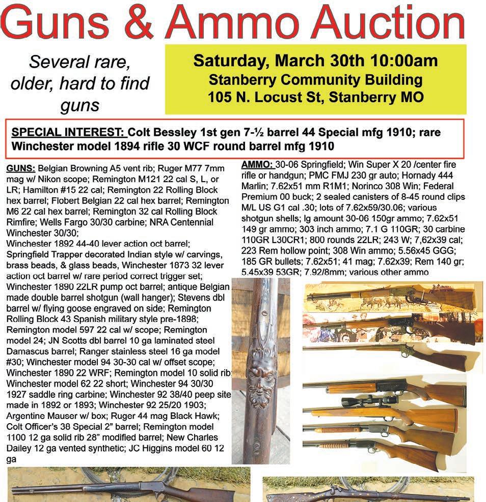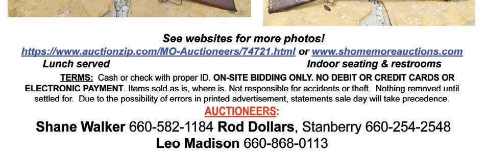 www.jumpsandroyauction.com 2x5 GHWP 3-12-24 TERMS: Cash or check w/ proper I.D. Not responsible for accidents, thefts, or errors in advertising. Announcements made day of auction take precedence over all advertisements. DIRECTIONS: From Hwy 13, go east on Richardson St. to Prospect, turn south one-half block to sale site on east side of the street. Watch for Sale Signs. JR Auction.qxp_Jumps Auctions 3/6/24 1:21 PM Page 2 • ADVANCE NOTICE • REAL ESTATE & PERSONAL PROPERTY AUCTION SATURDAY, MARCH 30, 2024 • 10:00 A.M. SALE LOCATION: 609 S PROSPECT STREET, GALLATIN, MO 64640 Real Estate: (Selling @ Noon) Ranch-style 3-bedroom, 1 bath home w/ full walkout basement. Home is approximately 1040 sq. feet w/ single car attached garage, front deck, family room, eat-in kitchen, central air, electric in-ceiling heat w/ independent heat control and vinyl replacement windows. Nice yard with storage shed. Terms: 10% non-refundable down payment due day of auction with balance due 30 days at closing. Real Estate is offered at reasonable reserve. Announcements made day of auction take precedence over all advertisements. The real estate is being sold “As Is” with no expressed or implied warranties pertaining to the property. Contact Jumps & Roy Auction, LLC @ 660-605-0860 or 660-359-1455 to view the property. Personal Property: Ford F150 – Household – Antiques – Collectibles Lawn & Garden – Tools See Pics & Complete Sale Bill @ www.shomemoreauctions.com or Jumps Auctions Facebook Late Maryetta & Donald Ray Auction SALE CONDUCTED BY: Jumps & Roy Auction, LLC Rustin Jumps & Scott Roy 660-605-0860 or 660-359-1455 www.jumpsandroyauction.com 2x5 GHWP 3-12-24 TERMS: Cash or check w/ proper I.D. Not responsible for accidents, thefts, or errors in advertising. Announcements made day of auction take precedence over all advertisements. DIRECTIONS: From Hwy 13, go east on Richardson St. to Prospect, turn south one-half block to sale site on east side of the street. Watch for Sale Signs. JR Auction.qxp_Jumps Auctions 3/6/24 1:21 PM Page 2 Caleb Newman • Albany, Mo. 64402 Call 660-822-6683 RESIDENTIAL & COMMERCIAL ELECTRICAL SERVICE & REPAIR • NEW INSTALLATIONS • REMODELS • NEW CONSTRUCTION • TROUBLE SHOOTING • WE WANT YOUR BUSINESS 505 East Daniel • Albany, Missouri 64402 Email: newmanplumbing@yahoo.com TELEPHONE: 660-822-6680 • Installation • Repair • Replacement JASON NEWMAN LLC CALL US FOR ALL YOUR PLUMBING NEEDS! Albany, Missouri 64402 WWW.BIDCBM.COM EVERYTHING SELLS, NO RESERVES BIDDING CLOSES MAR 21st at 5:00 PM Contact Chris Riley with questions at 816.365.7565 or chrisriley@bidcbm.com Like us on Facebook Visit us on YouTube GETREGISTERED& BIDNOW!! ABSOLUTE ONLINE ONLY EQUIPMENT CONSIGNMENT AUCTION 2488 S.E. Hwy 33, Lathrop, MO SIDING & SEAMLESS GUTTERING For Free Estimates, Call Zack Ward • 660-868-1127 INSURED Auctioneers’ Note: Ammo will sell first; guns to start selling at 12:00. Pickett Auction Service, Inc. eddie pickett • 816-632-0700 TRENT mumm • 660-238-3960 www.pickettauction.com TERMS: Cash or Valid Check. Not responsible for Accidents, Thefts or Errors in Advertising. Announcements made at Auction take Precedence over all Advertising.. 2007 John Deere 2305 HST diesel compact tractor w/200 CX front loader & mower deck, 1086 hours; 1965 Ford; 2000 Tractor - Nice appearance; JD 647; 4’ roto tiller; Bison 3 pt rear blade; Ford 501 7’ sickle mower; 2 pull behind 60” Swisher mowers w/14 hp engines; DR 3 pt string trim mower; 540 PTO; Doolittle 16’ B.H. trailer w/2’ dove tail; Buck Dandy 5’x8’ BH trailer w/4’ ramp gate; 17’ canoe 1965 Oldsmobile 98 Coupe w/425 rebuilt engine, new paint, interior, new wheels & tires, sharp appearance, offered with reasonable reserve 1991 CRX fancy sports car 1961 Ford F100 pickup, restoration in progress 18 long guns & pistols Furniture & collectibles Good power & hand tools This is a partial list only - see website or call 816-632-0700 for auction hand bill. TOM & SHARON COATES SPECIAL AUCTION SAT. MARCH 23 • 9:30 A.M. 7370 GRIDLEY ROAD • STEWARTSVILLE, MO We have sold our property & will hold an auction north of Stewartsville, MO on Route N to Maple Grove Church then west to 7370 Gridley Rd. (Signs Posted) NICE AUCTION - LOTS OF VARIETY - MUST ATTEND ON TIME. PARTIAL LIST ONLY For all your STORAGE NEEDS, Call GINTHER RENTALS, 816-596-0366. FOR SALE - 20 ACRES M/L east of Alanthus Grove, MO. MARTIN FROM, 660-582-1453. 5-4TP HEREFORD BULLS FOR SALE: Excellent calving ease & docility, AI sired, heavily influenced by Sandhill Farm Genetics. FREE DELIVERY!! SARA OR GREG FRUEH AT 660-582-6901. HOPKINS, MO. NEW 2024 CARPORT BUILDINGS INSTALLED at any place, at good discounted prices and financing, any color, small or large, for your weather protection. RALPH KOBBE AUCTIONS & APPRAISALS GRANT CITY, MO 64456 660-582-6820.