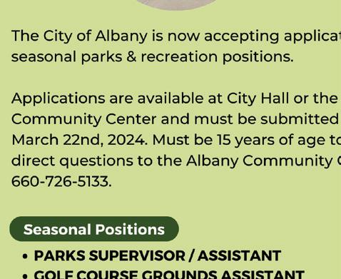 THE LORD’S WAREHOUSE UNTIL FURTHER NOTICE: WILL BE OPEN THE FIRST SATURDAY OF THE MONTH FROM 9:00 AM TO 1:00 PM ALL ARE WELCOME! THE FOOD PANTRY IS ALSO AVAILABLE HERE! COME AND SEE WHAT WE HAVE TO OFFER! Thank You... for all the donations and help through the years! WE’RE LOCATED 1 MILE EAST OF ALBANY ON THE NORTH SIDE OF HIGHWAY 136 - JUST WEST OF THE GOLF COURSE. PHONE: (660) 783-2235 AlbAny Community CAlendAr Mar. 11 FFA Lathrop CDE’s Mar. 11 Parent/Teacher Conferences Mar. 12 District ACT Test Date Mar. 13 Area II FFA Speaking Contest At Gallatin Mar. 14 VEG Spring Concert & Art Showcase 6:00 PM At The Middle School/High School Gym Mar. 14 Class & Spring Sports Pictures 8:00 AM - 2:00 PM Mar. 15 Flag Football Forms Due at ACC Mar. 16 V/JV Baseball Here with Plattsburg at 12:00 PM Mar. 18 V/JV Baseball Here with Northand Christian 4:00 PM Mar. 18 Varsity Tri-Meet Track Here At 4:00 PM Mar. 19 V/JV Baseball Here With Gilman City At 5:00 PM Mar. 20 Boys Golf At Stanberry Mar. 20 FFA Northwest District CDE’s At Cameron At 4:30 PM Mar. 21 Varsity Track At Worth County Early Bird Relays Mar. 21 FFA NCMC Ag Club Contest At Trenton Mar. 21 School Board Meeting At 6:30 PM Mar. 22 V/JV Baseball Here With Platte Valley At 5:00 PM • Chamber Meets the 3rd Wednesday of Every Month at Noon at Poppa’s • Albany Rotary Meets every Friday at Noon at the Albany Community Center GOINGWHAT’SHERE’S ON... 1204 W. Hwy 136 Albany, MO ~ 726-5577 HOURS 10 AM - 9 PM MON. - SAT. Compliments of... SATURDAY, MAY 18, 2024 Cost: $5 which includes your sale listing on the map that appears in the May 14 issue of The New Shopper & Tri-County Ledger as well as the free fliers located in businesses around town. It also includes a free garage sale sign indicating your sale number. Time: We recommend sellers stay open from 8:00 AM - 1:00 PM Minimum. DEADLINE: MUST HAVE YOUR LISTING BY WEDNESDAY, MAY 8 AT NOON TO BE INCLUDED ON SALE MAP AND FLIER. Make check payable to: New Shopper and bring in or mail it, along with the form, to: THE NEW SHOPPER 101 W. WOOD, ALBANY, MO 64402 660-726-5234 Albany City-Wide ALBANY CITY-WIDE GARAGE SALE Listing #: Date: Time: Address of sale: List of Items: Names: Phone: Use separate sheet of paper if needed Check Box If You Want Your Phone # In Ad For office use only Eckard’s 118 West Main St., Stanberry, MO 660-783-2611 or Toll Free 1-800-489-7832. After hours call 660-562-7692. Weekend calls welcome. Open 8-5 Monday-Friday, 8-3 Saturday or By Appointment “A Trusted Name For Over 60 Years!” Take it from our customers... Eckard’s can help! Cara Mattson, Sales Manager, has the ability and knowledge to help make your remodeling, building or redecorating project proceed smoothly. Call today and see how Eckard's can make a difference with your home improvement projects. "Cara helped us so much by picking out the right product and guiding us in the right direction." – Pete and Macia Kemper, Barnard Remodel 118 West Main St., Stanberry, MO 660-783-2611 or Toll Free 1-800-489-7832 Open 8 - 5 Monday-Friday, 8 - 1 Saturday “The staff at Eckard’s were very helpful in our whole project. We love the end result.” – Jennifer and Pete Hall, Maryville The sales team at Eckard’s in Stanberry, Mo. has the ability and knowledge to help make your remodeling, building or redecorating project proceed smoothly. Call today and see how Eckard’s can make a difference with your home improvement projects. Remodeling? 118 St., MO 660-783-2611 or Toll Free 1-800-489-7832 Open 8 - 5 Monday-Friday, 8 - 1 Saturday “A Trusted Name For Over 64 Years!!” Eckard’s 118 West Main St., Stanberry, MO 660-783-2611 or Toll Free 1-800-489-7832. After hours call 660-562-7692. Weekend calls welcome. Open 8-5 Monday-Friday, 8-3 Saturday or By Appointment “A Trusted Name For Over 60 Years!” Take it from our customers... Eckard’s can help! Cara Mattson, Sales Manager, has the ability and knowledge to help make your remodeling, building or redecorating project proceed smoothly. Call today and see how Eckard's can make a difference with your home improvement projects. "Cara was very helpful in our whole project. We love the end result." – Jennifer and Pete Hall, Maryville Al ban y TV Here’s What’s Coming Up On Albany TV! Albany TV Guide Baseball Here With Plattsburg At 12:00 PM Baseball Here With Northland Christian At 4:30 PM Mar. 18 Baseball Here With Gilman City At 5 PM Mar. 19 Mar. 16 Here's what's coming up on Albany TV March 16 - Baseball Home vs Plattsburg at 12PM March 18 - Baseball Home vs Northland Christian at 4:30PM March 19 - Baseball Home vs Gilman City at 5PM March 22 - Baseball Home vs Platte Valley at 5PM Baseball Here With Platte Valley At 5 PM Mar. 22 Clip & Save Clip & Save SECOND HARVEST MOBILE FOOD PANTRY Available to Anyone Open at 10:00 a.m. Monday, March 18 Monday, April 15 USDA COMMODITIES & SENIOR BOXES (Gentry County only & you must qualify) Open from 9:00 -10:30 a.m. Saturday, April 6 Saturday, May 4 Clip & Save Clip & Save ALBANY METHODIST CHURCH 2024 FOOD MINISTRY DATES 302 N. Smith St., Albany, MO, 660-726-5818. Ministerial Alliance FOOD PANTRY OPEN FROM 9:00 - 10:30 a.m. (for Albany School District residents) Tuesday, March 19 Tuesday, April 2, 16 & 30 WALMART EXCESS FOOD Available to Anyone Open from 9:00 - 10:30 a.m. Tuesday, March 19 Tuesday, April 2, 16 & 30 For questions or Food Emergencies, please call 660-726-5818. Office Hours 8:00 - Noon, M-F. Stop by to fill a bag with your choice of craft supplies. Enter a raffle for a chance to win an adult spring basket. Enjoy a coffee and snack. Everything is free! No registration required. This program is intended for adults and children with parental supervision. Questions? Call 660-582-5281. Sat, Mar 23, 11 AM-2 PM Library Basement, 509 N Main St. Craft supply donations accepted at the Front Desk Mar 11-20. Donating allows VIP early access at 10 AM. Donations not accepted outside of those dates. Parnell 
