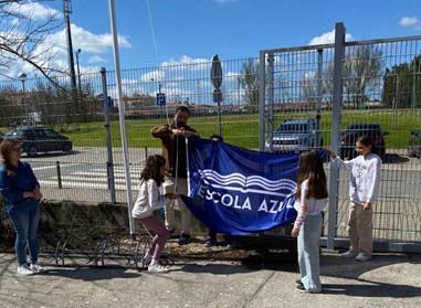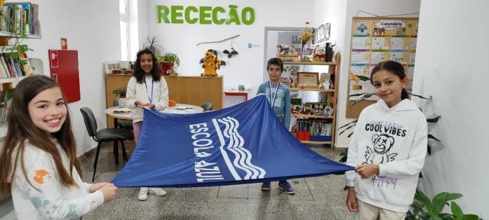 Os embaixadores da Escola Azul, Ellie Freitas e David Mendes e as colegas Mara e Sofia Tostka transportaram Bandeira até ao mastro.