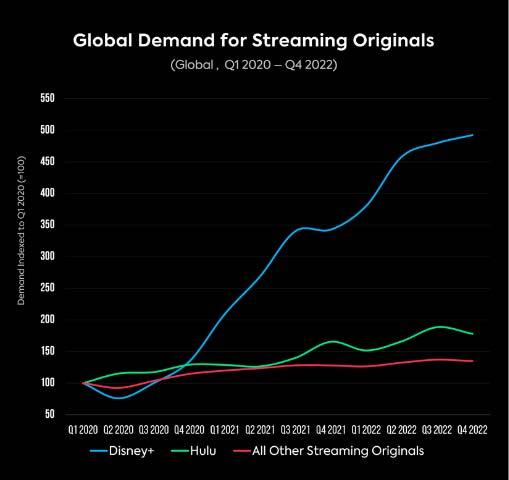 Según las mediciones de Parrot, desde el trimestre enero-marzo de 2020 hasta el trimestre julio-septiembre de 2022, la demanda global total de Disney+ Originals creció un 379,8%. Durante el mismo período de tiempo, el número de suscriptores globales de Disney+ aumentó de 33,5 millones a 164,2 millones, un aumento del 390,1%, lo que demuestra el notable vínculo entre la demanda de contenido original y el crecimiento de suscriptores SVOD.
