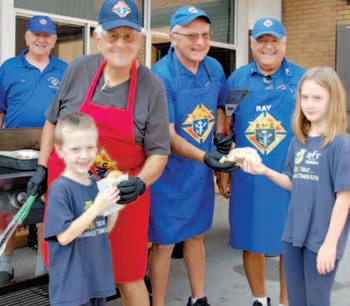 Fundraising to give back to local charities in the community, the St. Helen of the Cross Knights of Columbus Council 15999, with help from the St. Helen Parish CWL, has a busy September with community barbecues planned at local elementary schools including last week at St. John Catholic Elementary School. (L-R) Knights Tom Shepherd, George Savage, Kevin Kiley, Grand Knight Ray Francoeur and students Finley Roddick, 7, and McKenna Roddick, 11. McDonald - Photo