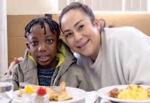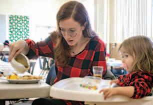 (Left) Kelsey Nelson pours syrup on pancakes for her daughter, Genesis, 2.
