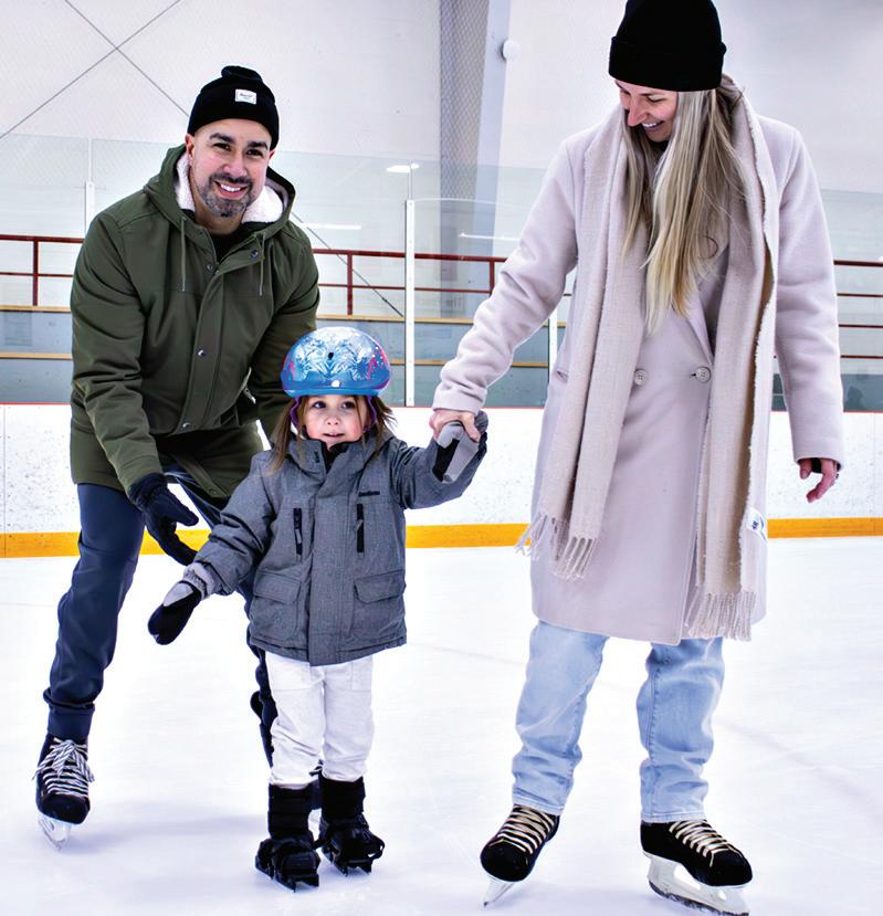Roberto Hauer, left, and his wife, Brianna, give daughter Ophelia, 3, a boost on the ice at a free Family Day skate in Grimsby’s Peach King Centre. Loree – Photo