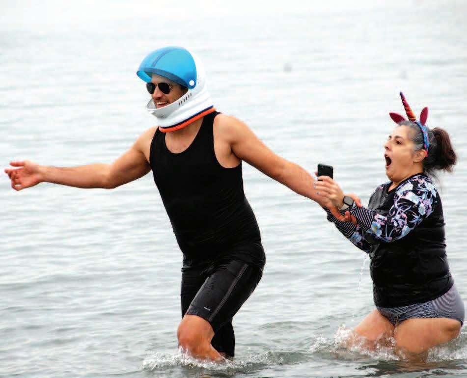Balmy conditions greeted Grimsby Polar Bear dip participants on New Year’s Day, but it was still a chilly experience. Here, making a bee line for the shore are Simon Boucher and Lucy Neves. For details, please turn to Page 4. McDonald - Photo