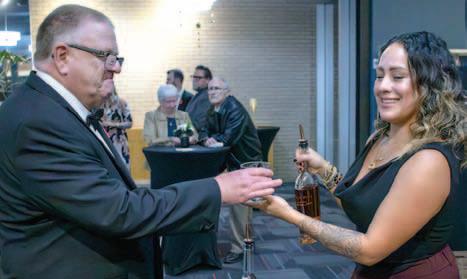 Gabriela Ariaspours a glass of Forty Creek Distillery’s finest for its master brewer Bill Ashburn at Friday night’s third annual Grimsby GLaM Gala at Grimsby Public Art Gallery and Grimsby’s library.