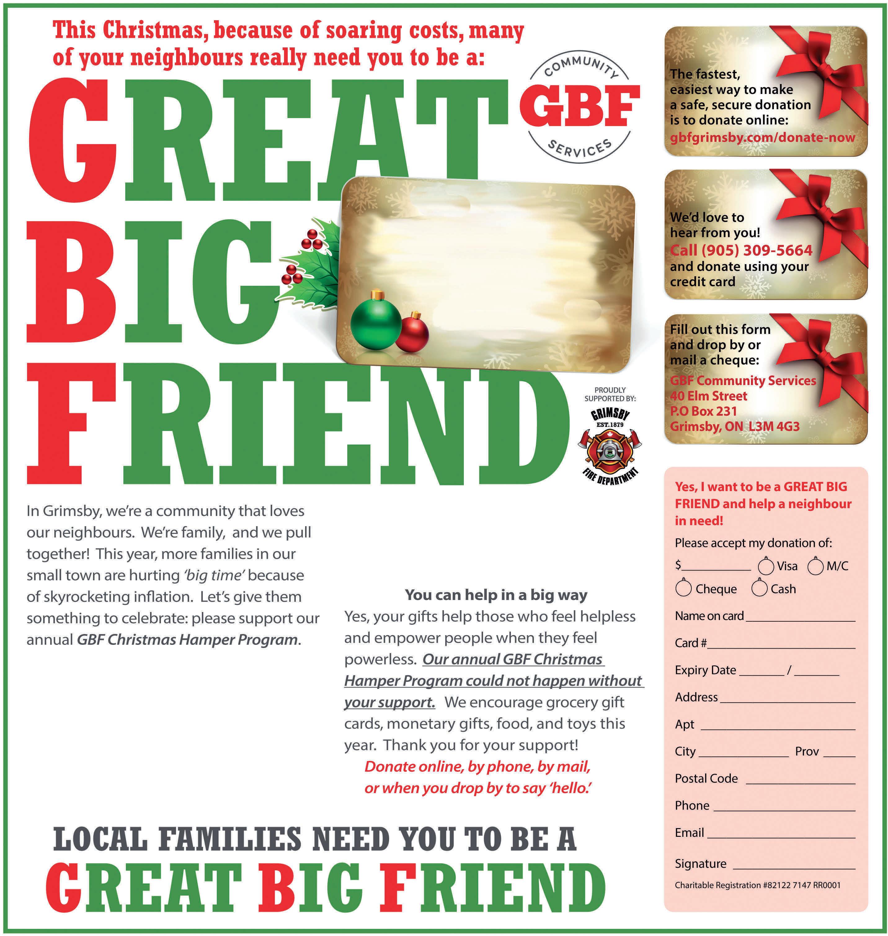 The Grimsby Firefighters Association is once again teaming up with GBF for the annual Christmas Hamper program. Firefighters will be walking at the front of the Grimsby Santa Claus parade Saturday, Dec. 6 and collecting donations.