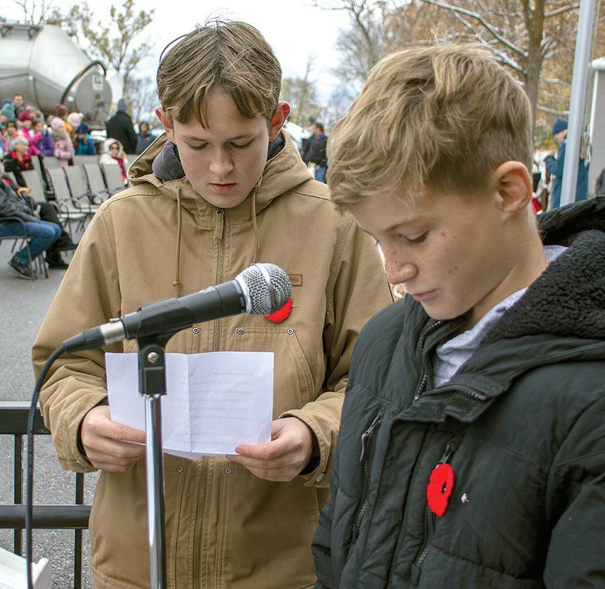 John Calvin Grade 8 students Seth Lenting and Eddie Jagt were two of three students reading In Flanders Fields at the Smithville Remembrance Day ceremony.