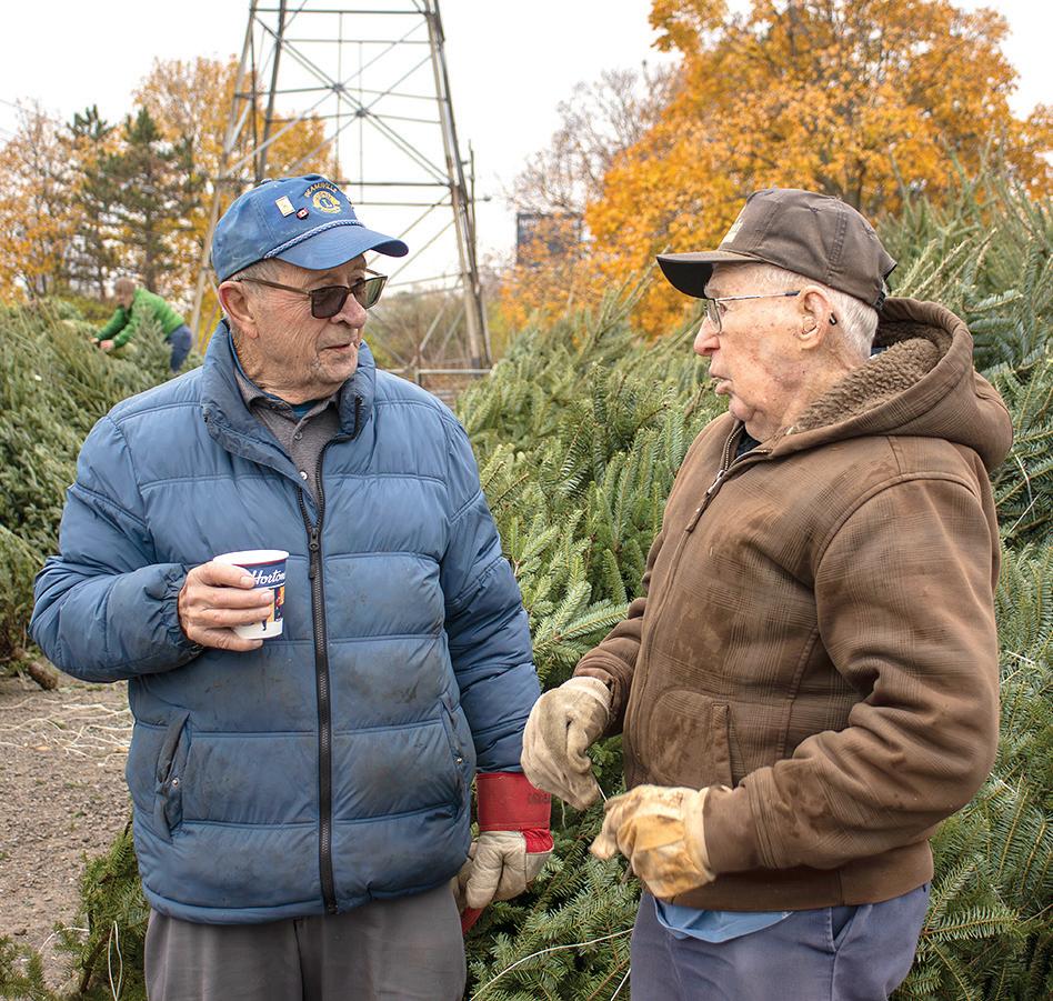 (Below) Scout Rosie Hugill-Bourque and Alivia Bartley, ages 13, help to unload over 500 Christmas trees delivered to the Lion’s lot.