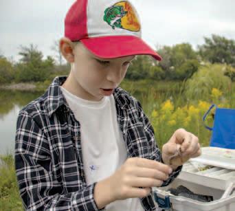 (Left) Hudson Kitching, 10, hooks a worm at Kids Fishing.