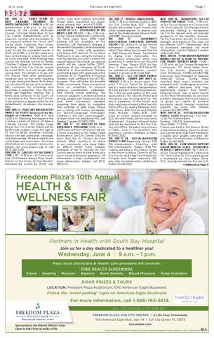 WED. JUN 18 - THERAPEUTIC TAI CHI OPEN TO THE PUBLIC 10:00 - 11:00 a.m. at Sun Towers Retirement Community 101 Trinity Lakes Dr. Our therapists have advanced training in therapeutic Tai Chi for Seniors and will provide guidance in this healthy exercise. Tai Chi has been proven to increase strength and balance! This class will be offered EVERY Wednesday due to increased demand. For more information, contact Debbie Caneen at 813-634-3347 WED. JUN 18 - YOUR MONEY MATTERS! MARKET RECAP & HOW TO PREPARE FOR RISING INTEREST RATES 10:00 11:00 a.m. at Sun Towers Retirement Community, 101 Trinity Lakes Drive, Sun City Center. Sponsored by Chris Redhead, CFP®,ChFC®,CFS®, Executive Vice President of Sequoia Financial Group. During these turbulent times many investors are plagued with challenging questions and difficult decisions that may significantly impact their family’s financial future. Join us each month on the third Wednesday as we share prudent strategies that have helped us guide our clients to achieve successful results through uncertain markets. For more info: Debbie Caneen 813-892-2990. WED. JUN 18, 25 - SOCIAL BALLROOM DANCE CLASS Beginning - Fox Trot 12:45 PM, Intermediate Rumba - 2:00 PM, Intermediate Silver Waltz - 3:15 PM. Classes are held in the Dance Studio in the Atrium building. Open to all Sun City Center and Kings Point Residents. Couples and Singles welcome. $5/ per class. For information call Bernice DuBro at 634-3205. WED. JUN 18 - LOW VISION SUPPORT GROUP WITH DR. OLIVA - SPONSORED BY THE SCC MEN’S CLUB 1:30 - 2:30 p.m. at Sun Towers Retirement Community 101 Trinity Lakes Dr. This support group is facilitated by Ana Maria Oliva, M.D. and Sponsored by the Sun City Continued on Page 8