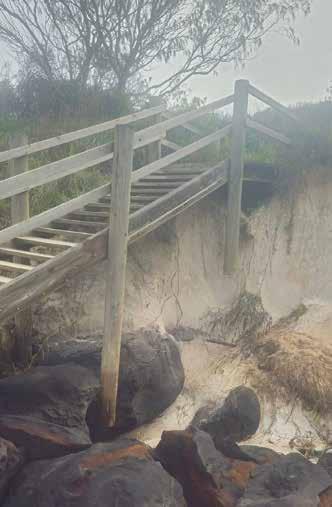 q Damaged beach access stairs, north of the lake’s entrance. Photo: Jarrad Lawless.