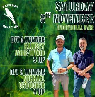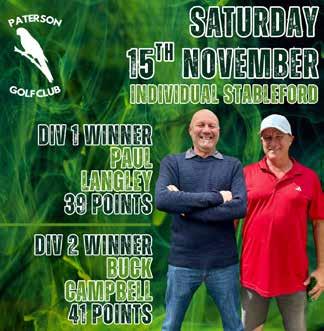 Stableford & Match Play Championships (Semi-Finals), 22-Nov Individual Stableford & Match Play Championships (Final), 29-Nov Individual Stableford & 2BBB. Schedule subject to change. SATURDAY 15TH NOVEMBER INDIVIDUAL STABLEFORD FIELD | 34 members & 1 visitor DIVISION 1 (<15) | Winner Paul Langley (14) 39 Points, Runner Up Ramsey Vane-Wood (6) 38 Points, 3rd Place Robert Richardson (15) 37 Points DIVISION 2 (16-36) | Winner Buck Campbell (27) 41 Points, Runner Up Ted Zawirski (31) 39 Points, 3rd Place Margaret Walker (23) 36 Points BALL COMP | Greg Scott (5) 36 Points, Michael Croucher (19)