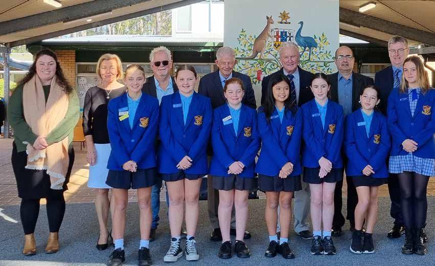 q (Back row L-R) Parliamentary Advisor Krista Barrie, Sue Estens, Councillor Paul Sandilands, Daryl Martin, Rear Admiral Peter Sinclair, Bulahdelah Central School Principal George Frangos, Tea Gardens Public School Principal Mark Clemson, (Front row L-R) Ivy-Pearl Carter-Hughes, Danyelle Fitzgerald, Ebony Hestelow, Kora Constantino, Stella Jacobsen, Hannah Price, and Ali Partridge.