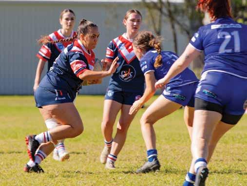 q Nambucca Roosters Women’s Tackle player Charlize Jones on the attack.