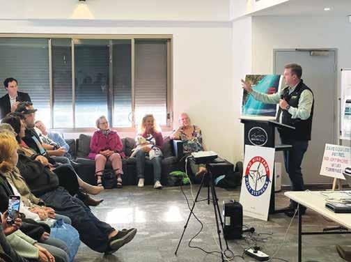q Nationals Senator Ross Cadell addresses anti-offshore wind farm campaigners at an event at Birubi SLSC.