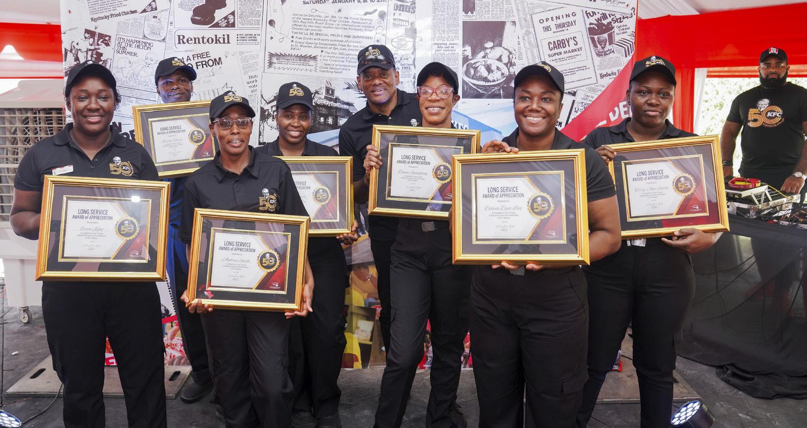 Celebrating Dedication: KFC team members proudly display their Long Service Awards in recognition of over 10 years of commitment and excellence. These awards were presented at the Old Hope Road KFC branch as part of KFC’s 50th birthday celebration, marking five decades of flavour, service, and teamwork.