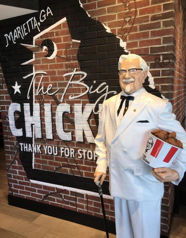 So, the next time you’re in the area and need something to drink (or eat), stop at the most iconic building in Cobb County, enjoy the spectacle of the chicken’s beak opening and its eyes rolling, take a selfie with the Colonel, and just appreciate this singular structure. •