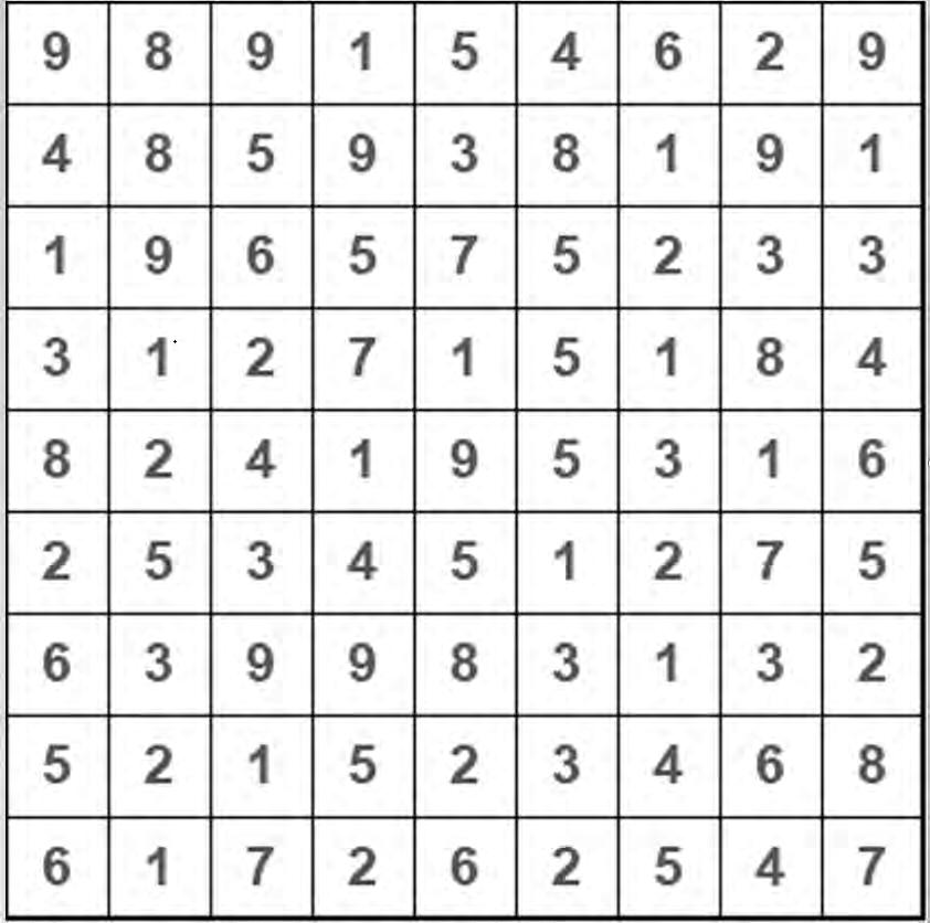 Âû÷¸ðêèâàÿ ïîâòîðÿþùèåñÿ öèôðû, äîáåéòåñü, ÷òîáû â êàæäîé ñòðîêå è â êàæäîì ñòîëáöå âñå öèôðû áûëè ðàçëè÷íûìè. Çà÷¸ðêíóòûå êëåòêè ìîãóò êàñàòüñÿ äðóã äðóãà òîëüêî óãëàìè, íî íå ñòîðîíàìè. Ïðè ýòîì îñòàâøàÿñÿ áåëîé îáëàñòü äîëæíà áûòü ñâÿçíîé, ò.å. íå äîëæíà ðàñïàäàòüñÿ íà îòäåëüíûå ÷àñòè.