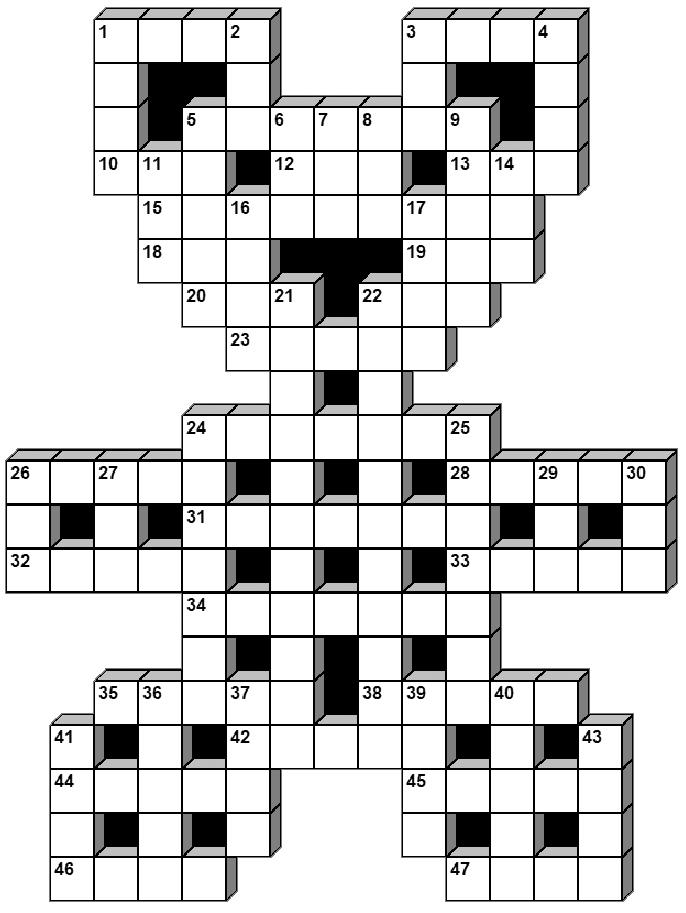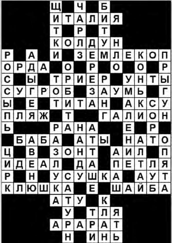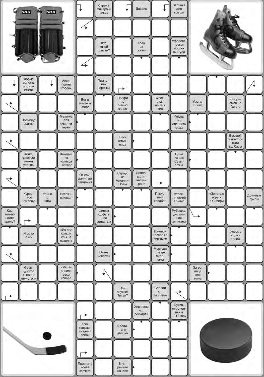 Ïî ãîðèçîíòàëè: 1. Ïðåñìûêàþùååñÿ, êîòîðîå ìîæíî ïðèãðåòü íà ãðóäè. 3. «Êàíàë» äëÿ äîæäåâîé âîäû. 5. Çàâñåãäàòàé ïîòàñîâîê. 10. Ïîæèëàÿ æåíùèíà, êîòîðàÿ íà îäíîé êàðèêàòóðå ìîæåò ñäàòü êîìíàòó â ëþáîì ðàéîíå ãîðîäà. 12. Áåçîáðàçíûé âåëèêàí-ëþäîåä èç ñêàçîê. 13. «Øàíöåâûé» ñïîäðó÷íèê êàïèòàíà Âðóíãåëÿ. 15. Ïåñòóí ãðÿäîê. 18. Ñóäíî äëÿ ïóòåøåñòâèÿ òð¸õ ìóäðåöîâ. 19. Æàëÿùàÿ ñëàäêîåæêà. 20. Âñå ìû âåä¸ì åãî îò Àäàìà ñ Åâîé. 22. Ïîïóãàé, êàê íè ÷èòàé. 23. Ñïîñîá ðàçãàäêè ìèðîâûõ òàéí ïóò¸ì îòêðûòèÿ íîâûõ çàãàäîê. 24. Ñâåòèëüíèê, îñâåùàþùèé îáðàçà. 26. Ðîññèéñêàÿ àêòðèñà, èñïîëíèâøàÿ ðîëü Äàøè â ôèëüìå «Êóáàíñêèå êàçàêè». 28. Ïëàñòèëèíîâîå âàÿíèå. 31. Õîòÿ íàçâàíèå ýòîãî çëàêà è óêàçûâàåò íà ñòðàíó, îòêóäà îí ïîÿâèëñÿ, îäíàêî, ó ñåáÿ íà ðîäèíå îí ÿâëÿåòñÿ äåôèöèòîì è ââîçèòñÿ òóäà èç Ðîññèè è Óêðàèíû. 32. Ýòà ñîáàêà, õîòÿ âíåøíå è ïîõîæàÿ íà äîìàøíèõ, ñîâñåì íå óìååò ëàÿòü. 33. Äàìñêèé ãîëîâíîé óáîð, ïðèçâàííûé â àðìèþ. 34. «Ïàïêèíà çàâÿçêà». 35. Èçîáðåòàòåëü ðàäèî. 38. Òðóæåíèöà ñëóæáû çíàêîìñòâ ïîçàïðîøëîãî âåêà. 42. Èãðàÿ â ýòó èãðó, èìïåðàòîð Íåðîí, ñëó÷àëîñü, ñòàâèë íà îäèí áðîñîê 400 òûñÿ÷ ñåñòåðöèåâ. 44. Óòåïëèòåëü äëÿ îäåæäû. 45. Ëåãåíäàðíûé îñíîâàòåëü äèíàñòèè, ê êîòîðîé ïðèíàäëåæèò Èâàí Ãðîçíûé. 46. Ïðîôåññèîíàëüíàÿ íàãðàäà ðîññèéñêèõ êèíåìàòîãðàôèñòîâ. 47. Ìàòåðèàë ñóïîâîãî âåíêà.