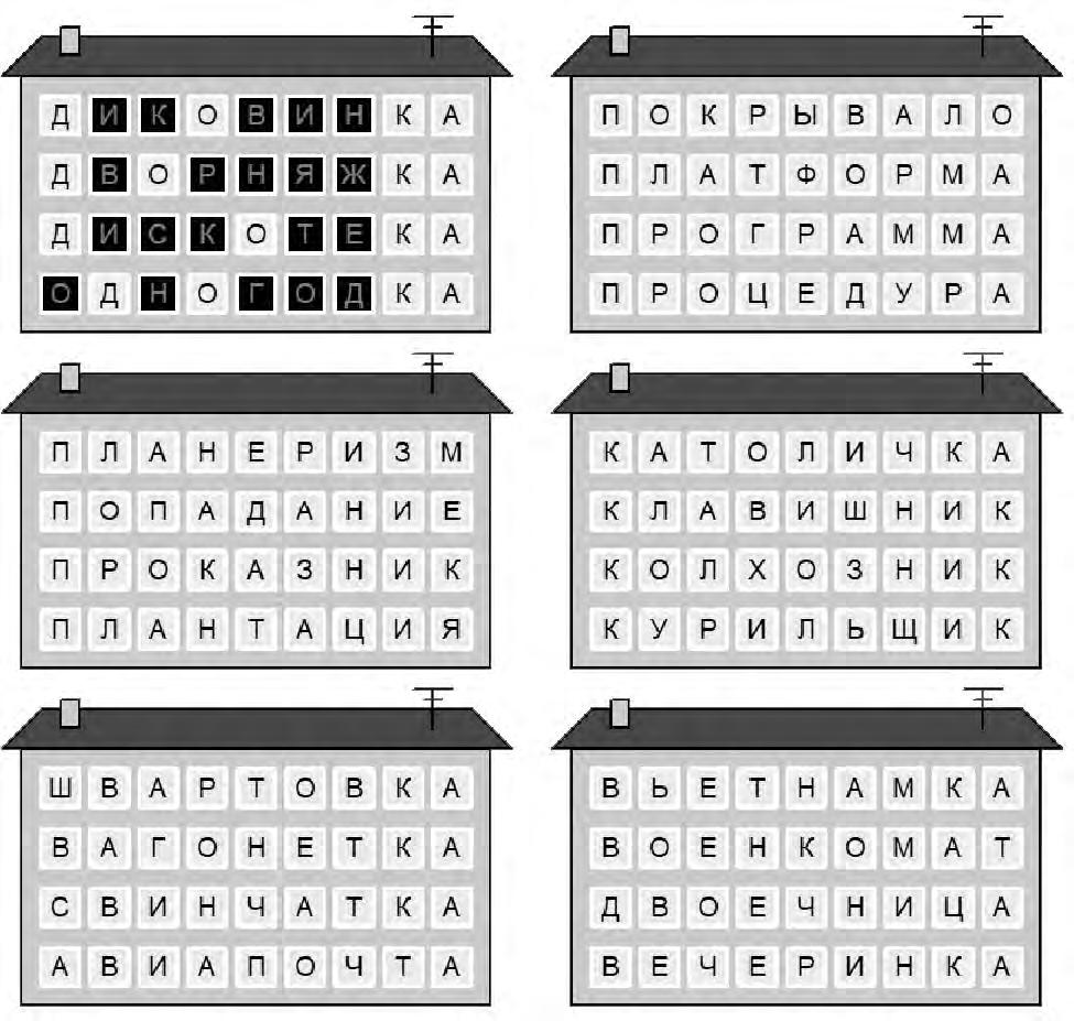 ÒÓØÈÒÅ ÑÂÅÒ. Âûêëþ÷èòå ñâåò â íåêîòîðûõ îêíàõ (çàêðàñèâ ñîîòâåòñòâóþùèå êëåòêè) òàêèì îáðàçîì, ÷òîáû â îñòàâøèõñÿ êëåòêàõ êàæäîãî äîìà ÷èòàëèñü îäíè è òå æå ñëîâà. ÏÐÈÌÅÐ ÐÅØÅÍÈß: