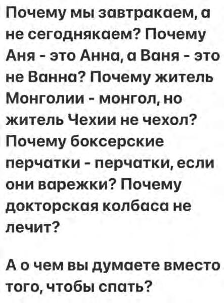 - Çà÷åì ó âàñ âåð¸âêà âèñèò â âàííîé? - À ýòî íà òîò ñëó÷àé, åñëè âàì ñòàíåò ïëîõî. Âû ïîä¸ðãàåòå, è ê âàì ïðèäóò íà ïîìîùü. - Äà, íî ìû íåñêîëüêî ðàç ä¸ðãàëè, è íèêòî íå ïðèø¸ë! - À ìû ê ðóññêèì â ïåðâûé äåíü íå ïðèõîäèì.