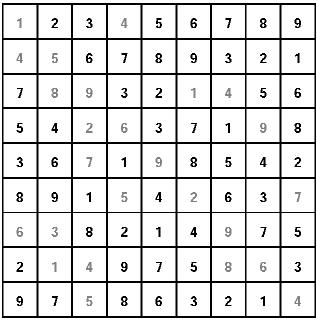 ïðåäñòàâëÿåò ñîáîé ìàòðèöó ñ ÿ÷åéêàìè 9õ9, êîòîðàÿ ðàçäåëåíà íà áîëåå ìåëêèå ñåêòîðû ðàçìåðîì 3õ3. Äëÿ ðåøåíèÿ ãîëîâîëîìêè íåîáõîäèìî, ðóêîâîäñòâóÿñü ëîãèêîé è ðàñ÷¸òîì, ïîäîáðàòü íåäîñòàþùèå öèôðû îò 1 äî 9. Ñäåëàòü ýòî íóæíî òàê, ÷òîáû êàæäàÿ öèôðà ïðèñóòñòâîâàëà, íå ïîâòîðÿÿñü, â êàæäîì ðÿäó, êàæäîé êîëîíêå è êàæäîì ñåêòîðå. Ïðàâèëüíî çàïîëíåííàÿ ìàòðèöà îçíà÷àåò: âû - ïîáåäèòåëü! Ïîìíèòå, ÷òî, ðàçãàäûâàÿ «Ñóäîêó», âû ïîëó÷àåòå âîçìîæíîñòü ñîâìåñòèòü ïðèÿòíîå ñ ïîëåçíûìíàòðåíèðîâàòü âíèìàíèå