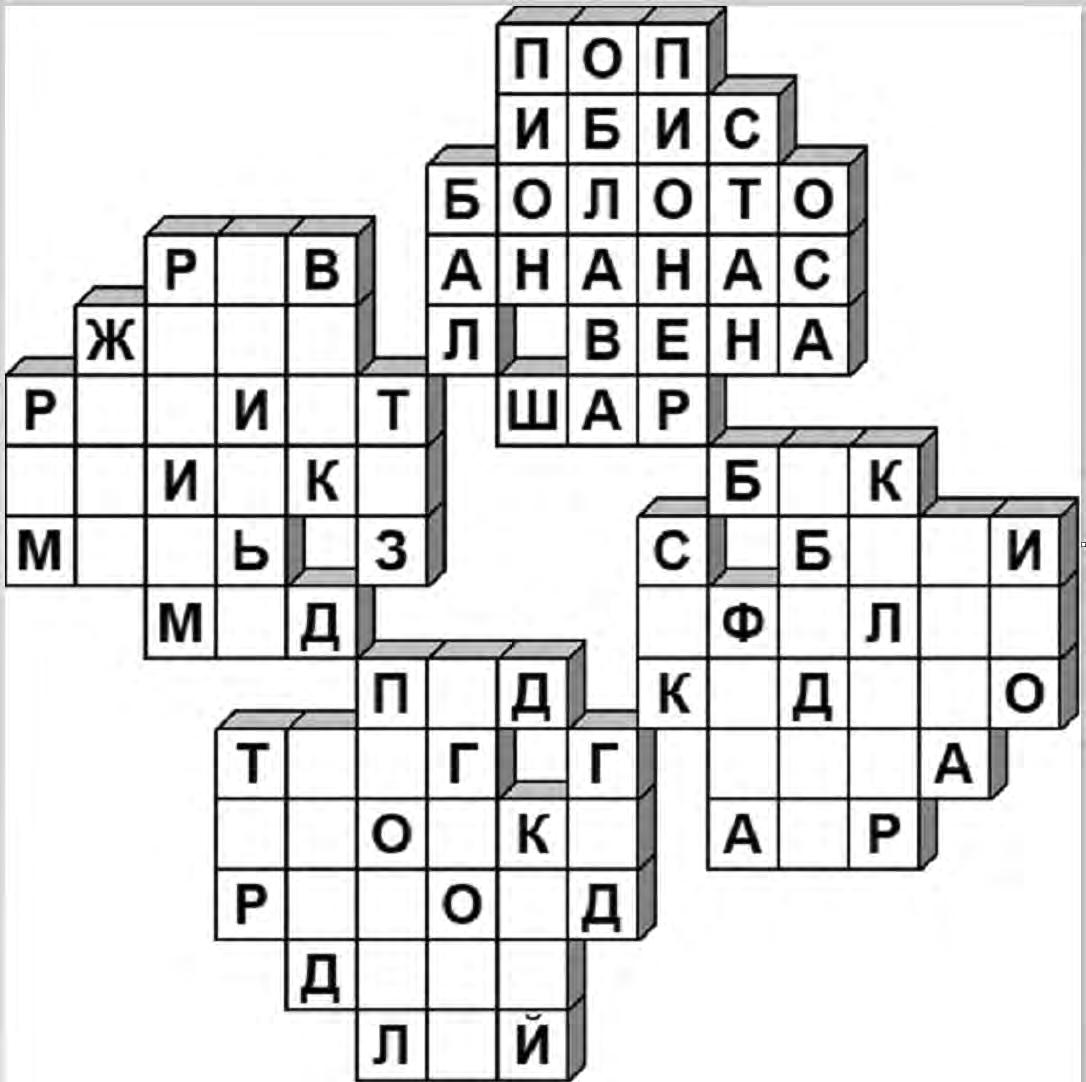 Äîïîëíèòå êâàäðàòû íåäîñòàþùèìè áóêâàìè òàêèì îáðàçîì, ÷òîáû ñëåâà-íàïðàâî è ñâåðõó âíèç ÷èòàëèñü ñëîâà.