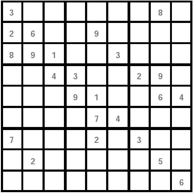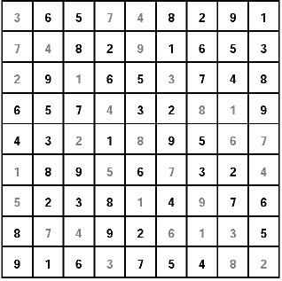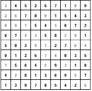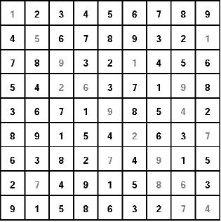 ïðåäñòàâëÿåò ñîáîé ìàòðèöó ñ ÿ÷åéêàìè 9õ9, êîòîðàÿ ðàçäåëåíà íà áîëåå ìåëêèå ñåêòîðû ðàçìåðîì 3õ3. Äëÿ ðåøåíèÿ ãîëîâîëîìêè íåîáõîäèìî, ðóêîâîäñòâóÿñü ëîãèêîé è ðàñ÷¸òîì, ïîäîáðàòü íåäîñòàþùèå öèôðû îò 1 äî 9. Ñäåëàòü ýòî íóæíî òàê, ÷òîáû êàæäàÿ öèôðà ïðèñóòñòâîâàëà, íå ïîâòîðÿÿñü, â êàæäîì ðÿäó, êàæäîé êîëîíêå è êàæäîì ñåêòîðå. Ïðàâèëüíî çàïîëíåííàÿ ìàòðèöà îçíà÷àåò: âû - ïîáåäèòåëü! Ïîìíèòå, ÷òî, ðàçãàäûâàÿ «Ñóäîêó», âû ïîëó÷àåòå âîçìîæíîñòü ñîâìåñòèòü ïðèÿòíîå ñ ïîëåçíûì