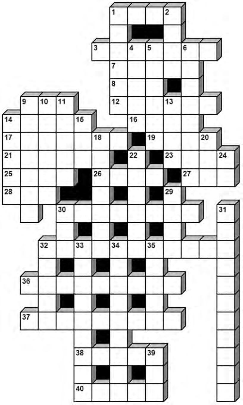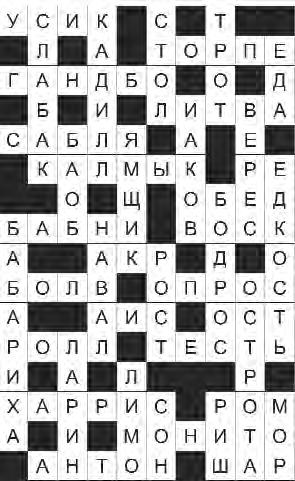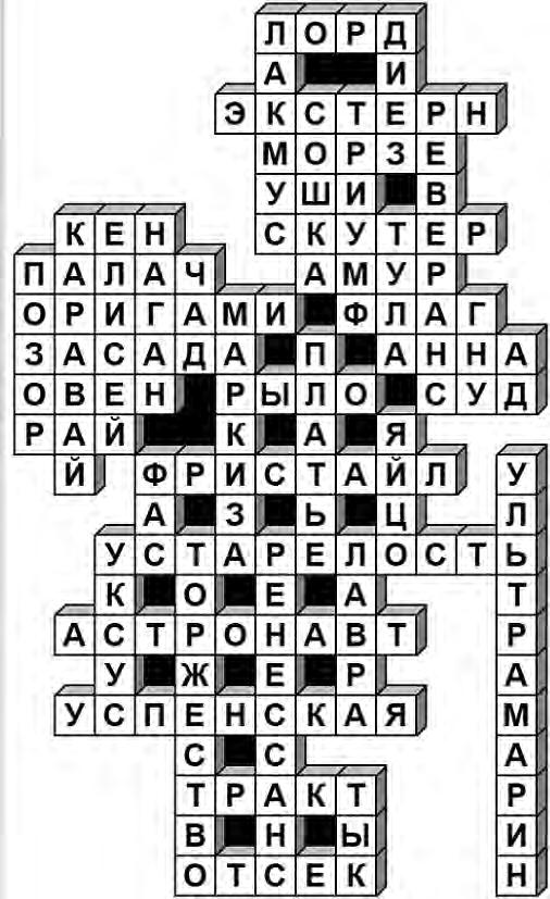 1. Òèòóë Ãëåíàðâàíà èç ðîìàíà Æþëÿ Âåðíà «Äåòè êàïèòàíà Ãðàíòà». 3. Ñàìûé ñàìîñòîÿòåëüíûé ó÷åíèê. 7. Ñîçäàòåëü àçáóêè äëÿ «ñòóêà÷åé». 8. Ïðåäåë âëþáë¸ííîñòè. 9. Ïàðåíü äëÿ êóêëû Áàðáè. 12. Îäíîìåñòíûé ñïîðòèâíûé ãëèññåð ñ ïîäâåñíûì äâèãàòåëåì. 14. Êòî ñ ýøàôîòà æèâûì óõîäèò? 16. «Ýðîòè÷åñêàÿ» ðåêà íà Äàëüíåì Âîñòîêå. 17. ßïîíñêîå áóìàãîòâîð÷åñòâî. 19. ×òî ïîäíèìàþò íà ôëàãìàíñêîì êîðàáëå ôëîòà ïî ïðèáûòèè íà íåãî êîìàíäóþùåãî? 21. Îòñèäêà äëÿ ñûùèêà. 23. «Øåéíîå óêðàøåíèå» èç ðàññêàçà Àíòîíà ×åõîâà. 25. Àïðåëüñêèé áàðàí. 26. Íå÷åëîâå÷åñêîå ëèöî. 27. Ìåñòî ïðåâðàùåíèÿ ïîäîçðåâàåìûõ â âèíîâíûõ. 28. Ëþáîå ìåñòî íà Çåìëå, ãäå íåò áóäèëüíèêîâ, ïîíåäåëüíèêîâ è íà÷àëüíèêîâ. 30. Ëûæíàÿ «ñâîáîäà». 32. ×òî ñàìîå ïëîõîå â ðóòèíå? 36. Ïèëîò øàòòëà. 37. Ðîññèéñêàÿ ýñòðàäíàÿ ïåâèöà, ñïåâøàÿ ïðî êàáðèîëåò. 38.  ñòàðîé Ðóñè - óëó÷øåííàÿ ãðóíòîâàÿ äîðîãà. 40. Èçîëÿòîð ñóáìàðèíû. Ïî âåðòèêàëè: 1. ×òî îò ù¸ëî÷è - ñèíååò, à îò êèñëîòû - êðàñíååò? 2. Íîòíûé çíàê, ïðåâðàùàþùèé ìè â ôà. 4. Åñëè ñ ëîæêîé ñåìåðî, òî ñ íåþ - îäèí. 5. Òîðæåñòâî ïî ïîâîäó ëè÷íîé ïîáåäû. 6. «Ïðèñåäàì-ñ». 9. Õëåá äëÿ âñòðå÷è ãîñòåé. 10. Êàêîé êîðîëåâè÷ «ì¸ðòâóþ öàðåâíó» â ãðîáó âèäåë? 11. Îðóæèå ïåñåííîé Ìóðêè. 13. Ýòîò ðîññèéñêèé ãîðîä óïîìèíàåòñÿ â àíàëîãå ïîãîâîðêè «âîçèòü ñîâ â Àôèíû». 14. Íåñìûâàåìîå ïîêðûòèå äëÿ ïðåäàòåëÿ è òðóñà. 15. Îçåðî ñ èçûñêàííûì æèðàôîì ó Íèêîëàÿ Ãóìèë¸âà. 18. «Òèòóëîâàííûé» íàâåñ îò ñîëíöà. 20. Àíòèëîïà, îáèòàþùàÿ â Àôðèêå. 22. Êîôòà, ñøèòàÿ ñ þáêîé. 24. Çàâåäåíèå äëÿ çàãðîáíîãî ïåðåâîñïèòàíèÿ ãðåøíèêîâ. 29. ×òî íóæíî ðàçáèòü ïåðåä èñïîëüçîâàíèåì? 30. Êîìàíäà ïîêóñàòü. 31. Öâåò ïòèöû óäà÷è â ïåñíå Àíäðåÿ Ìàêàðåâè÷à. 32. Ñëàäêèé íà õàëÿâó. 33. ×óâñòâî ðàäîñòè, óäîâëåòâîðåíèÿ. 34. Ýïîõà Ëåîíàðäî. 35. Êèåâî-Ïå÷åðñêèé ìîíàñòûðü. 39. Îñíîâà ïðîñòîãî ìåòîäà. Îòâåòû íà ñòð.42
